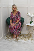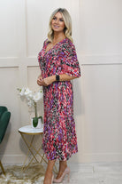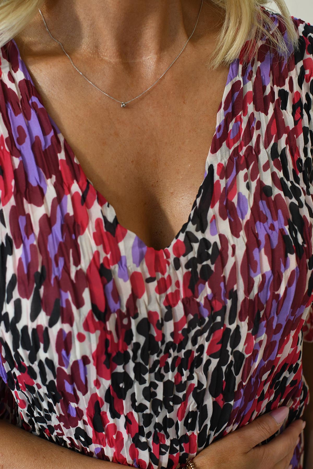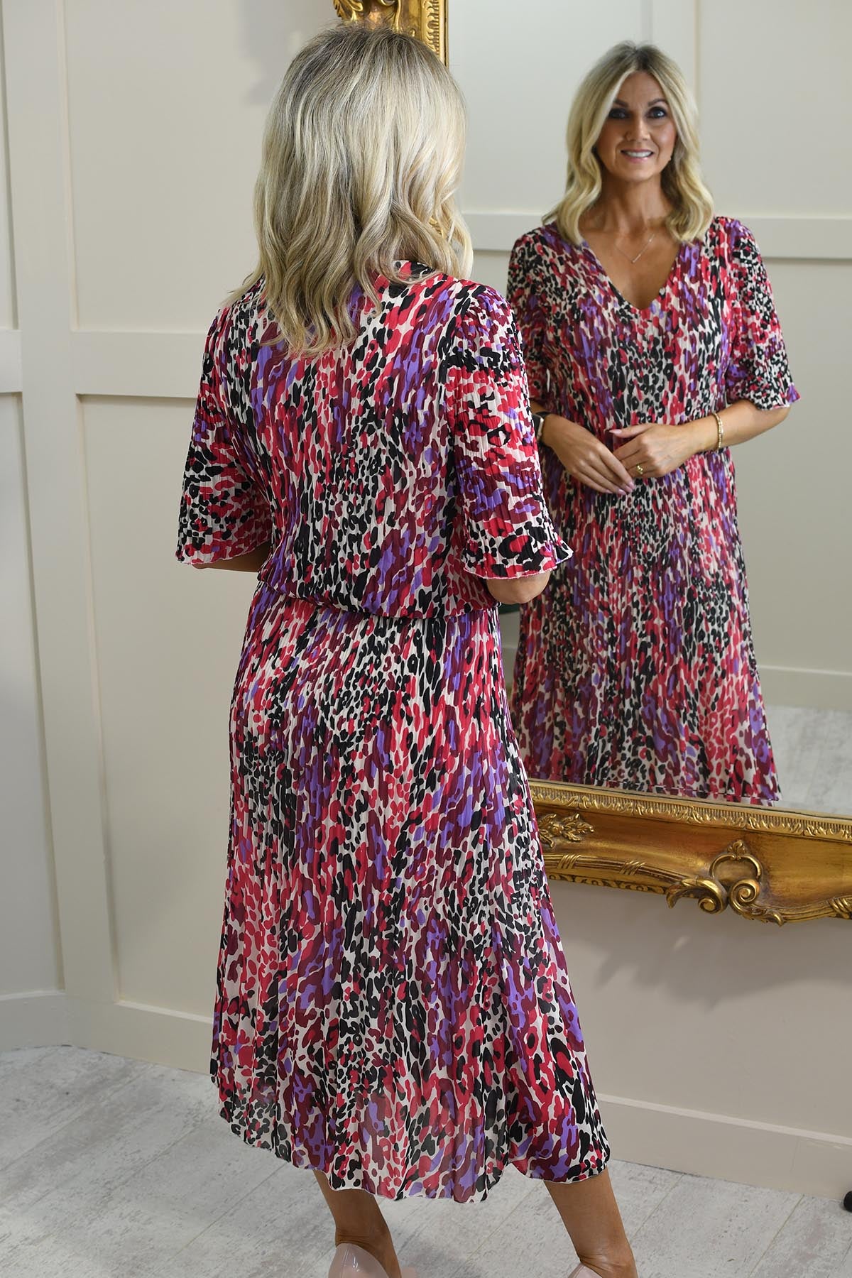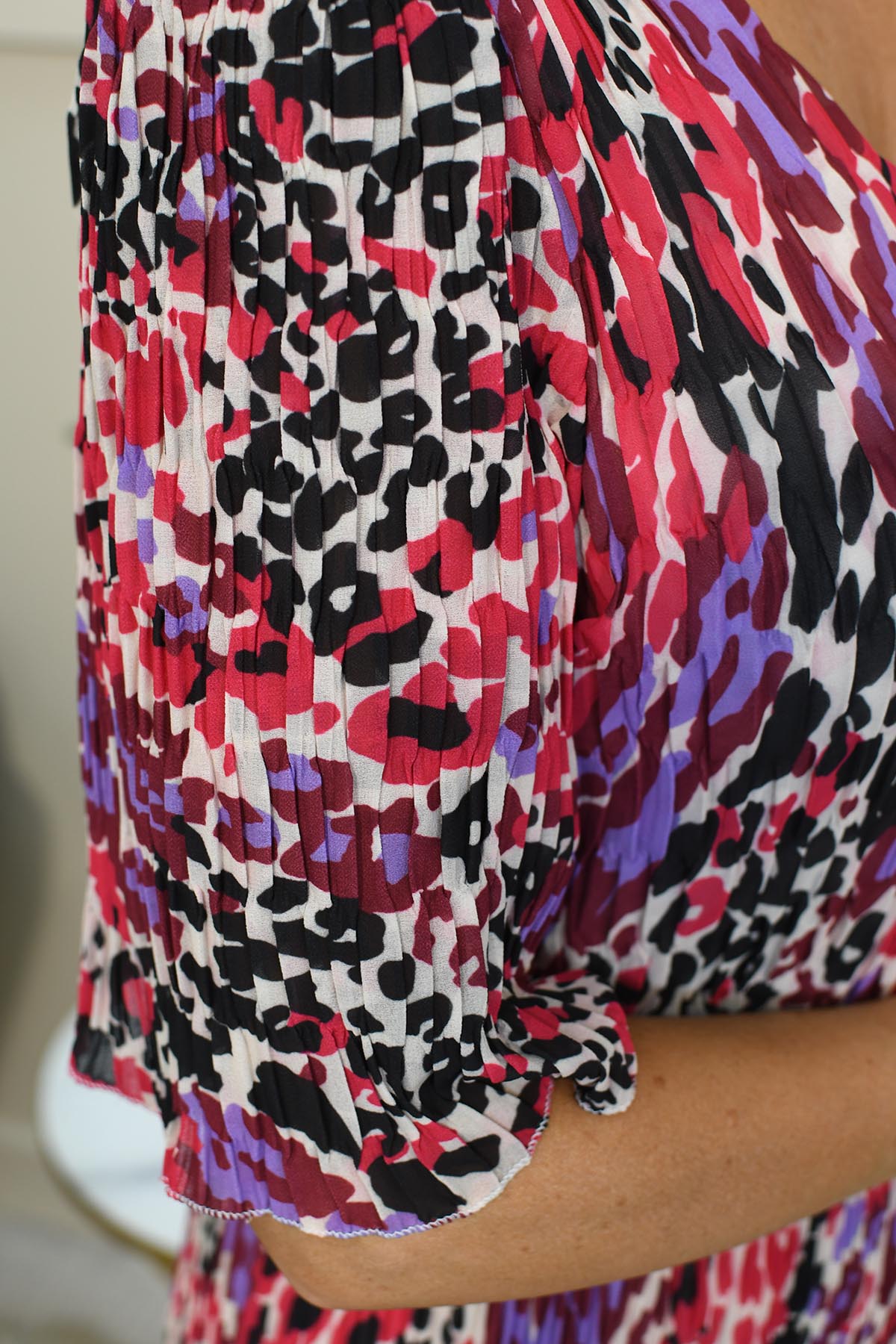 Kyla Mixed Berry Animal Print Plisse Dress Description