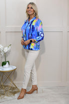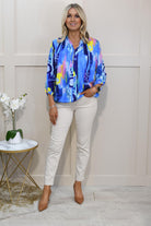 Introducing the YEW Blue, Yellow & Pink Abstract Orbit Print 1/4 Button Top, a vibrant addition to your wardrobe. Crafted from a soft blend of 95% viscose and 5% elastane, this top offers a comfortable fit with a gentle stretch. The eye-catching abstract orbit print in shades of blue, yellow, and pink adds a playful touch, while the 1/4 button front provides versatile styling options. Featuring a classic round neckline and short sleeves, this top pairs effortlessly with jeans or skirts for both casual outings and dressed-up occasions. Ideal for those seeking stylish and comfortable women's tops.