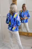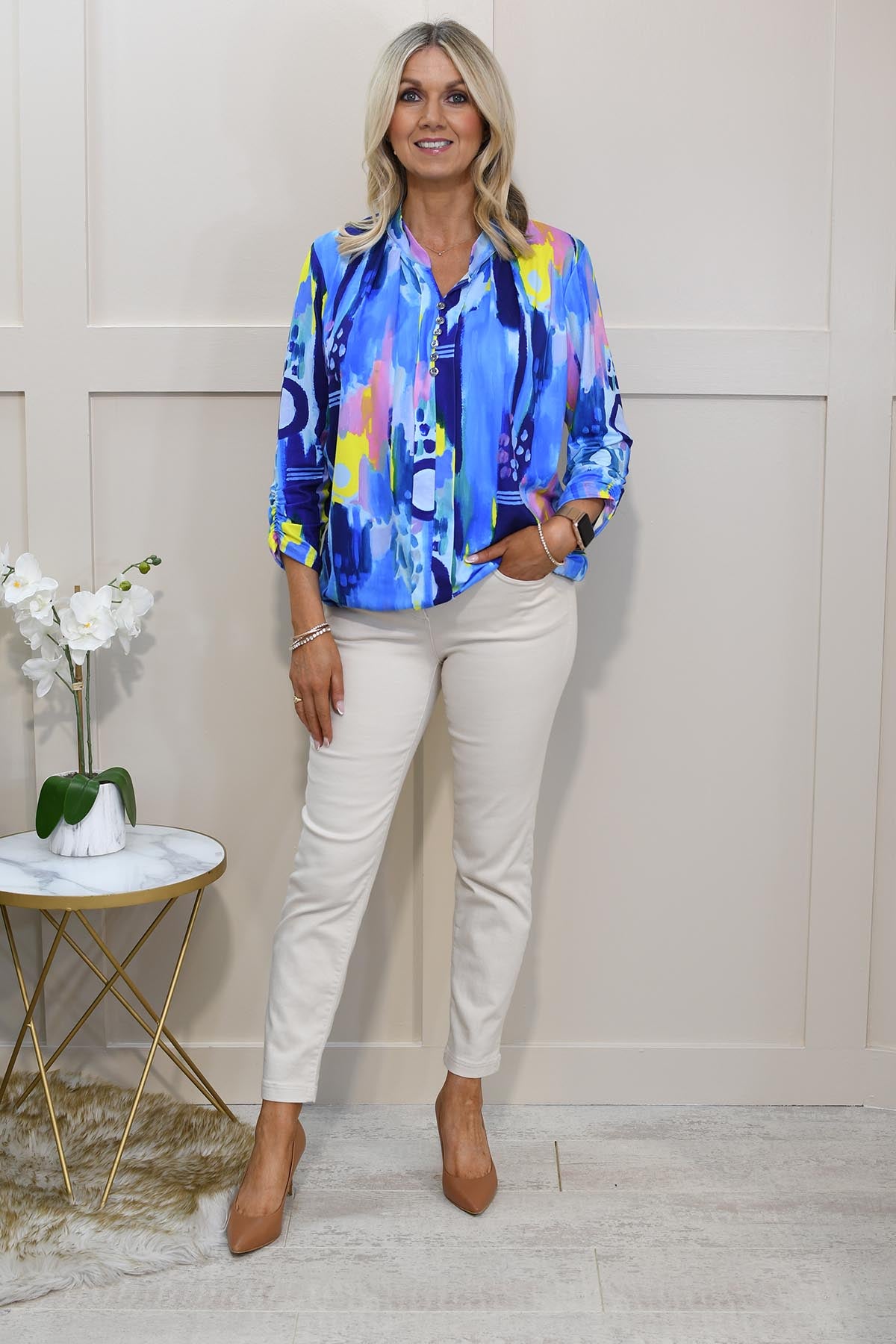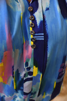 YEW Blue, Yellow & Pink Abstract Orbit Print 1/4 Button Top - 3902 Star