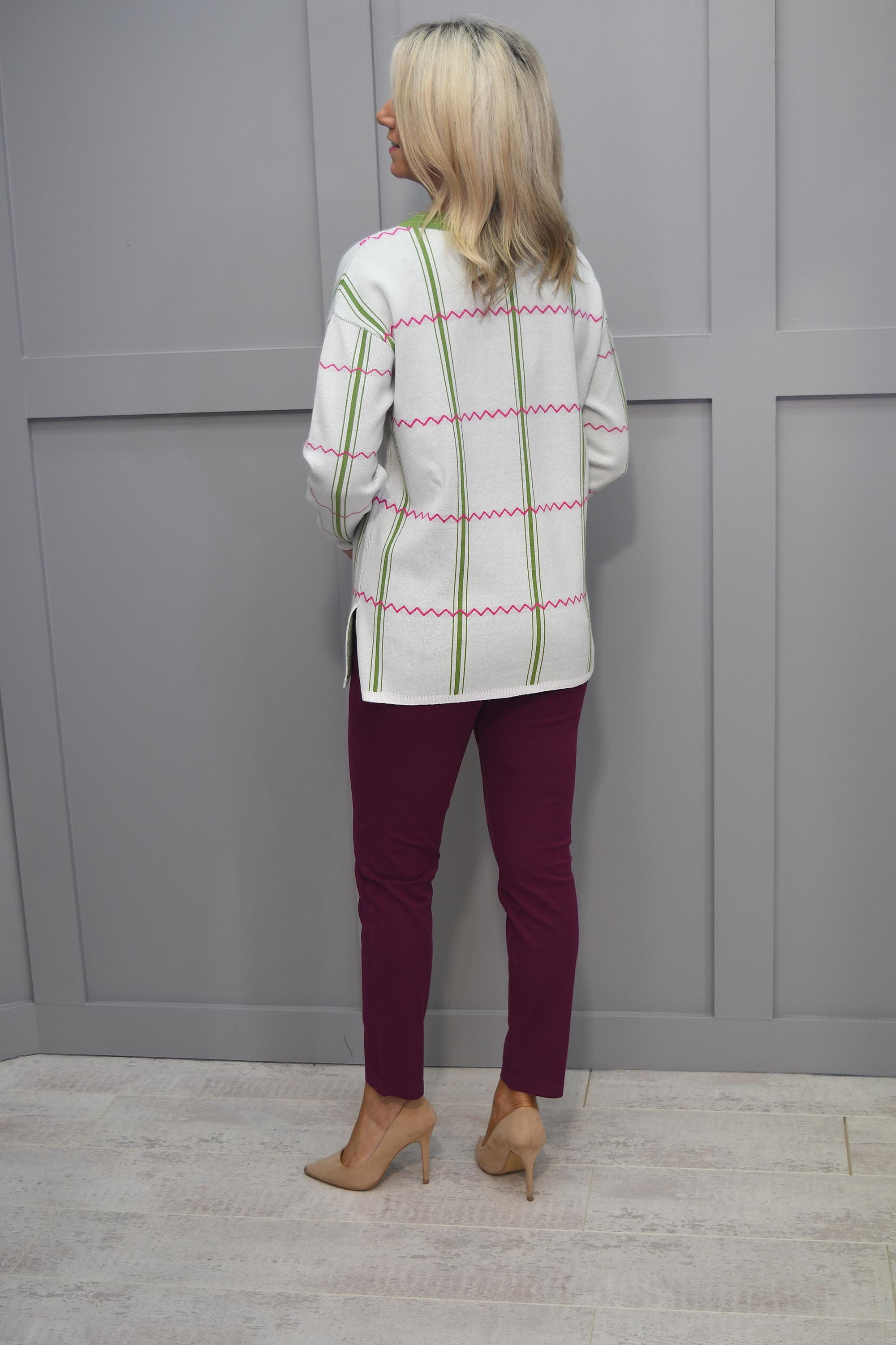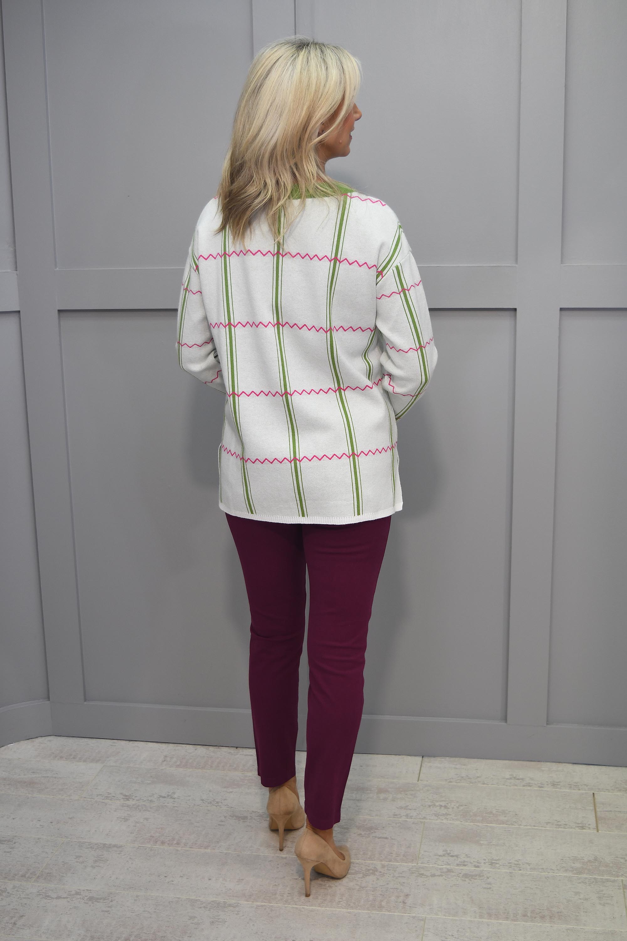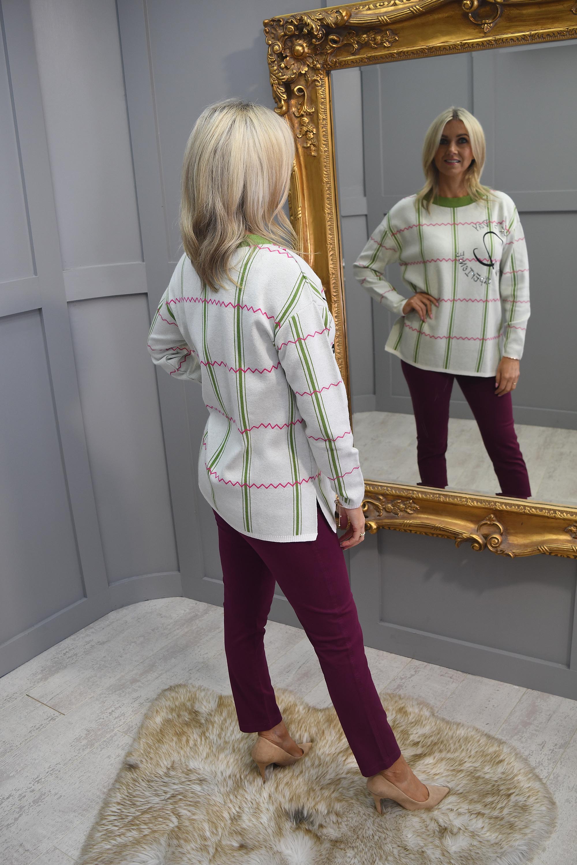 The exquisite PC Collection Cream & Green Round Neck Pattern Jumper with Diamanté Slogan, a captivating blend of elegance, charm, and a touch of sparkle that will undoubtedly become the centrepiece of your seasonal wardrobe.