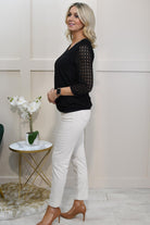 The Barbara Lebek Black Needle Lace Pattern Top is a timeless blend of elegance and comfort. Made from a soft and stretchy mix of 95% viscose and 5% elastane, this lightweight, breathable top ensures a flattering and comfortable fit. The delicate needle lace pattern adds a sophisticated touch, making it perfect for both casual and evening wear. Its classic black hue enhances versatility, effortlessly pairing with jeans, skirts, or tailored trousers. Whether styled for day-to-night dressing or seasonal layering, this Barbara Lebek top is a must-have for those who love chic and stylish fashion.