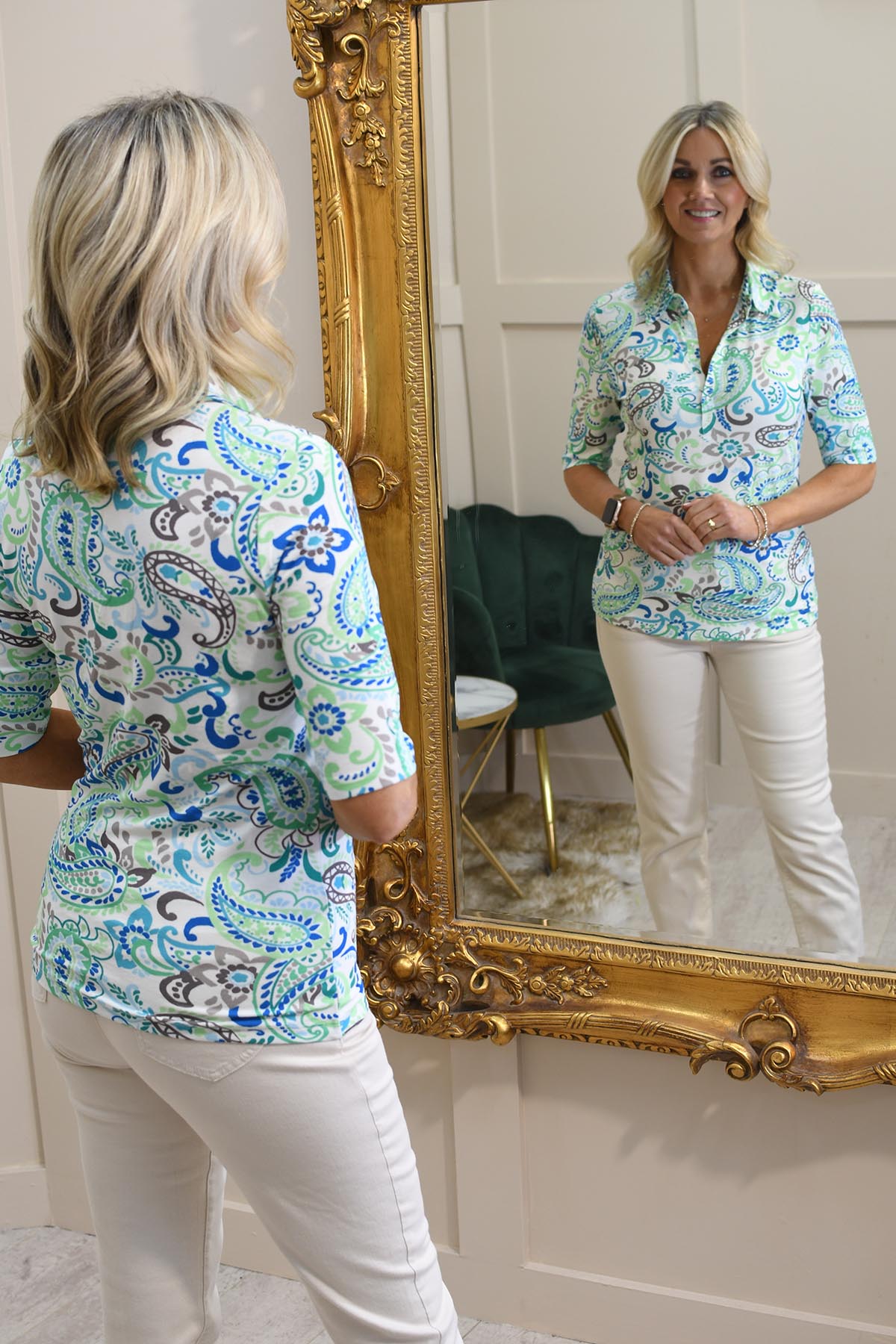 Barbara Lebek Green, Blue & Grey Paisley Print Polo Shirt- 82510052