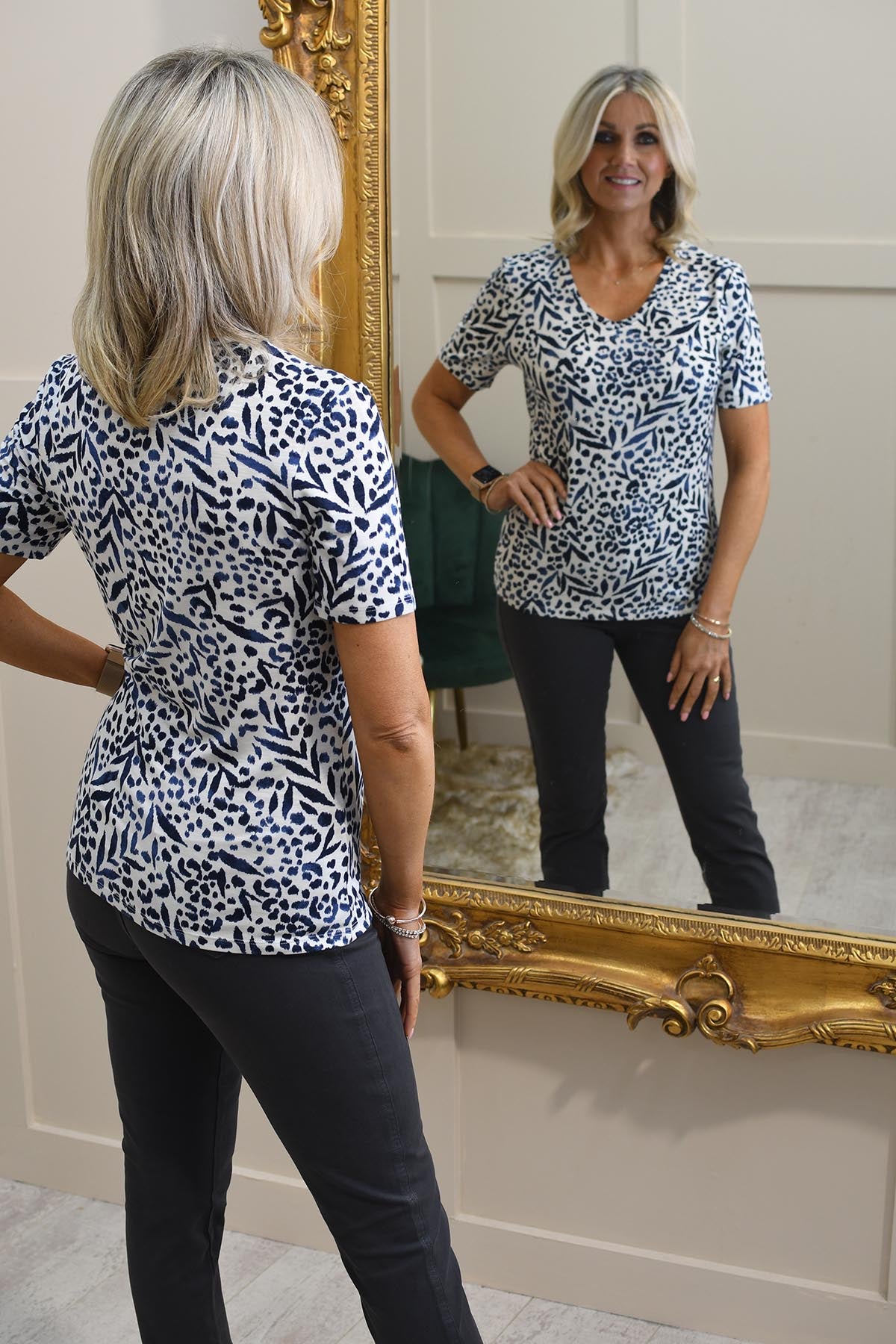 Elevate your casual wardrobe with the Barbara Lebek Navy & Panna Cotta Mixed Print Top. Crafted from a premium blend of 92% viscose and 8% elastane, this top offers exceptional comfort and a flattering fit. The lightweight fabric ensures breathability, making it perfect for everyday wear. Featuring a chic mixed print design in versatile navy and panna cotta hues, it effortlessly complements any outfit. The soft, stretchy material provides ease of movement, ideal for on-the-go lifestyles. Pair this top with jeans or tailored trousers for a stylish look.