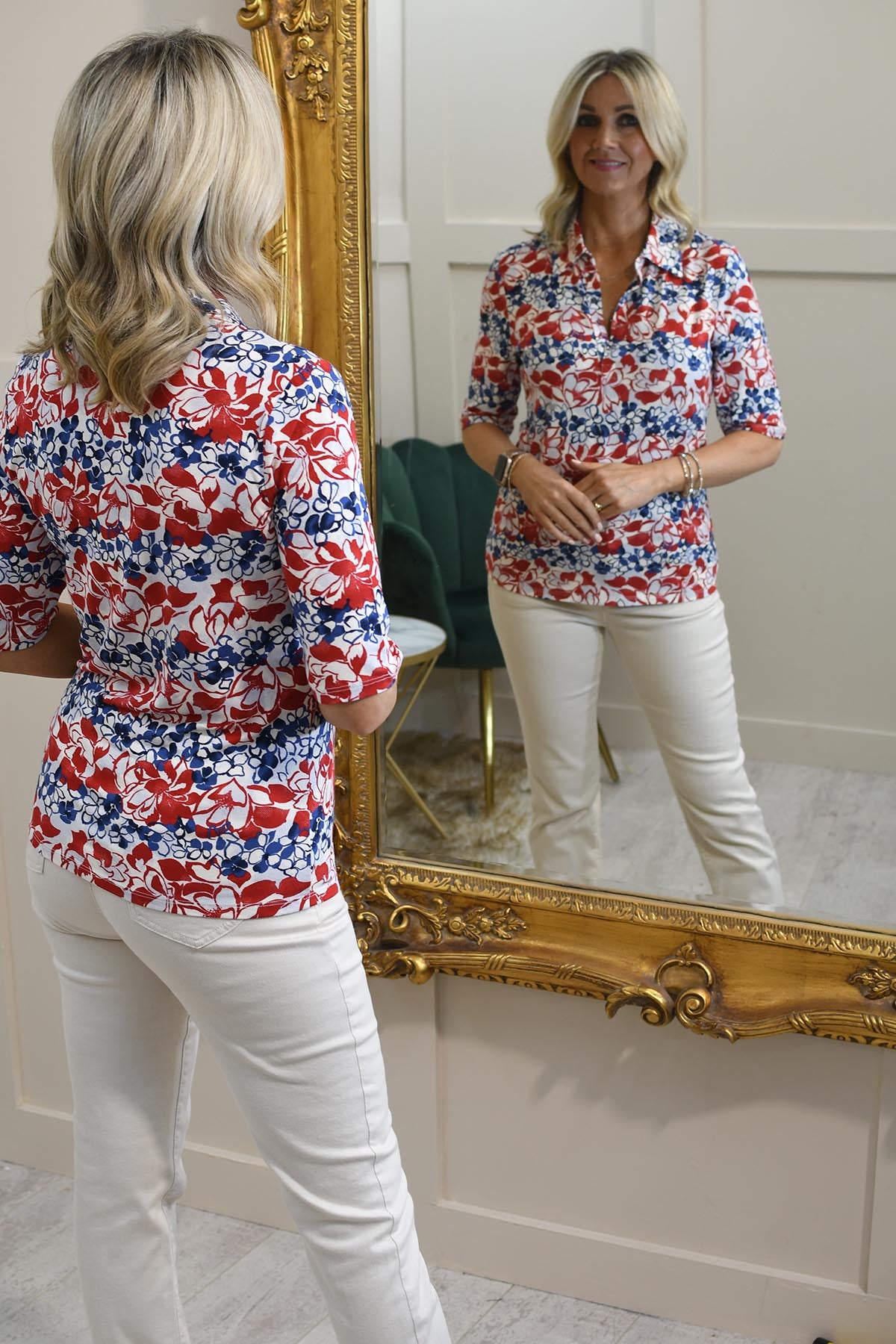 Barbara Lebek Navy, Red & Beige Floral Print Polo Shirt- 81010052