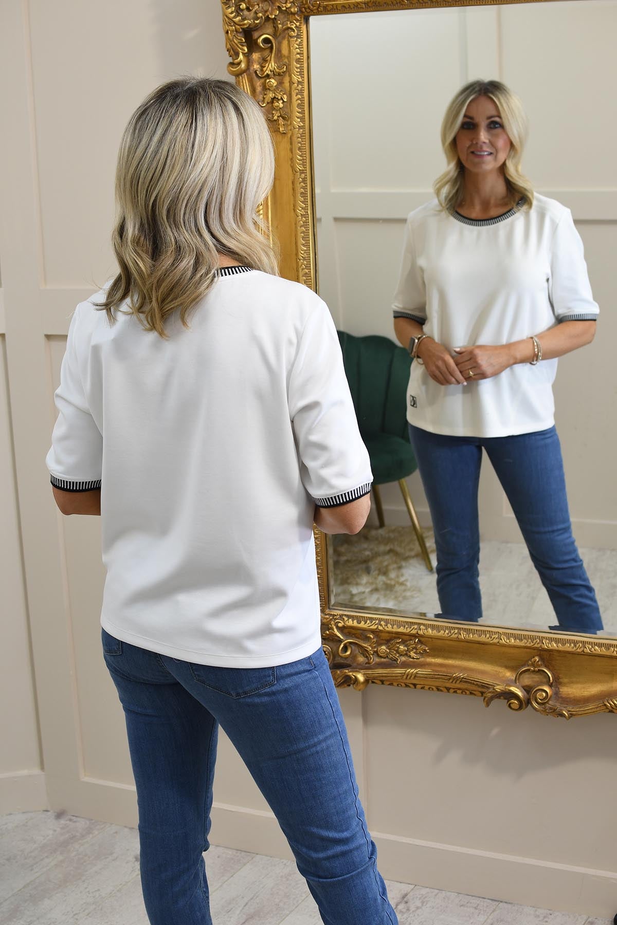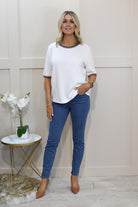 The I'CONA Cream Box Top With Black Trim is a sophisticated addition to your wardrobe, offering a modern and chic aesthetic. Made from a soft and stretchy blend of 55% viscose, 35% polyester, and 10% elastane, this top ensures comfort while maintaining its stylish shape. The boxy silhouette creates a contemporary, relaxed fit, while the contrasting black trim adds a touch of elegance and definition. Effortlessly versatile, it pairs beautifully with tailored trousers, skirts, or denim for both casual and dressy occasions. Add a hint of minimalist charm to your look with this standout piece.