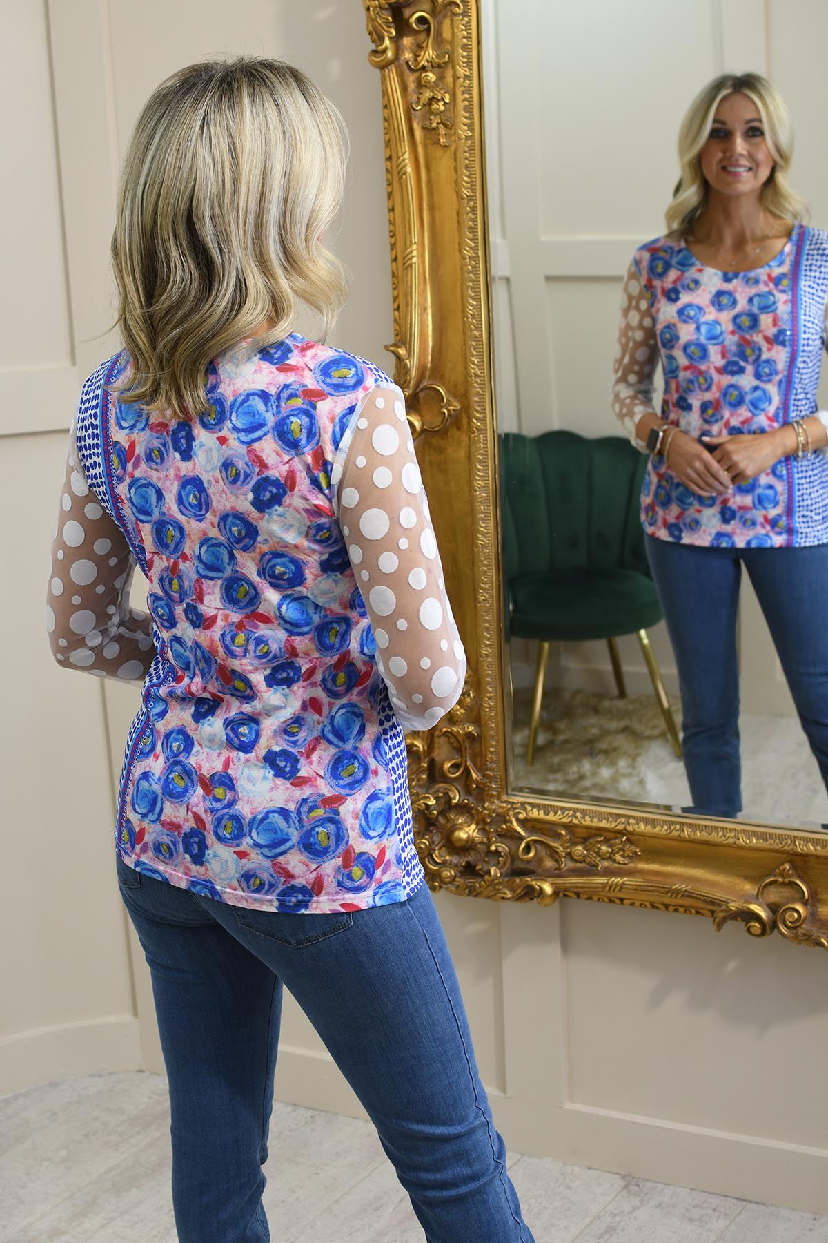 Libra Blue & Pink Abstract Print Top With Sheer Polka Dot Sleeve -LT1914