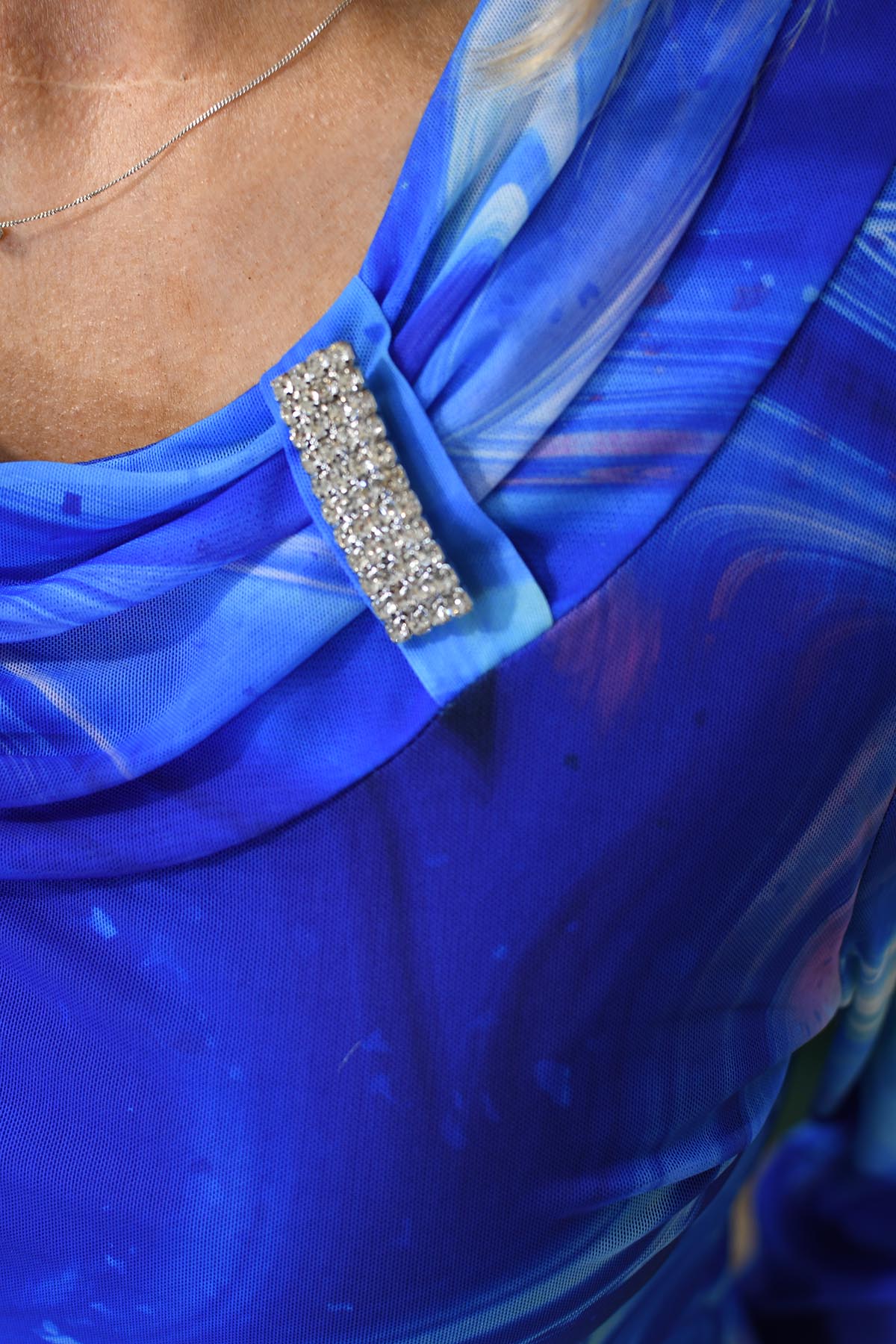 Via Veneto Cornflower Blue, Jade & Pink Swirl Cowl Neck Top With Brooch- V317
