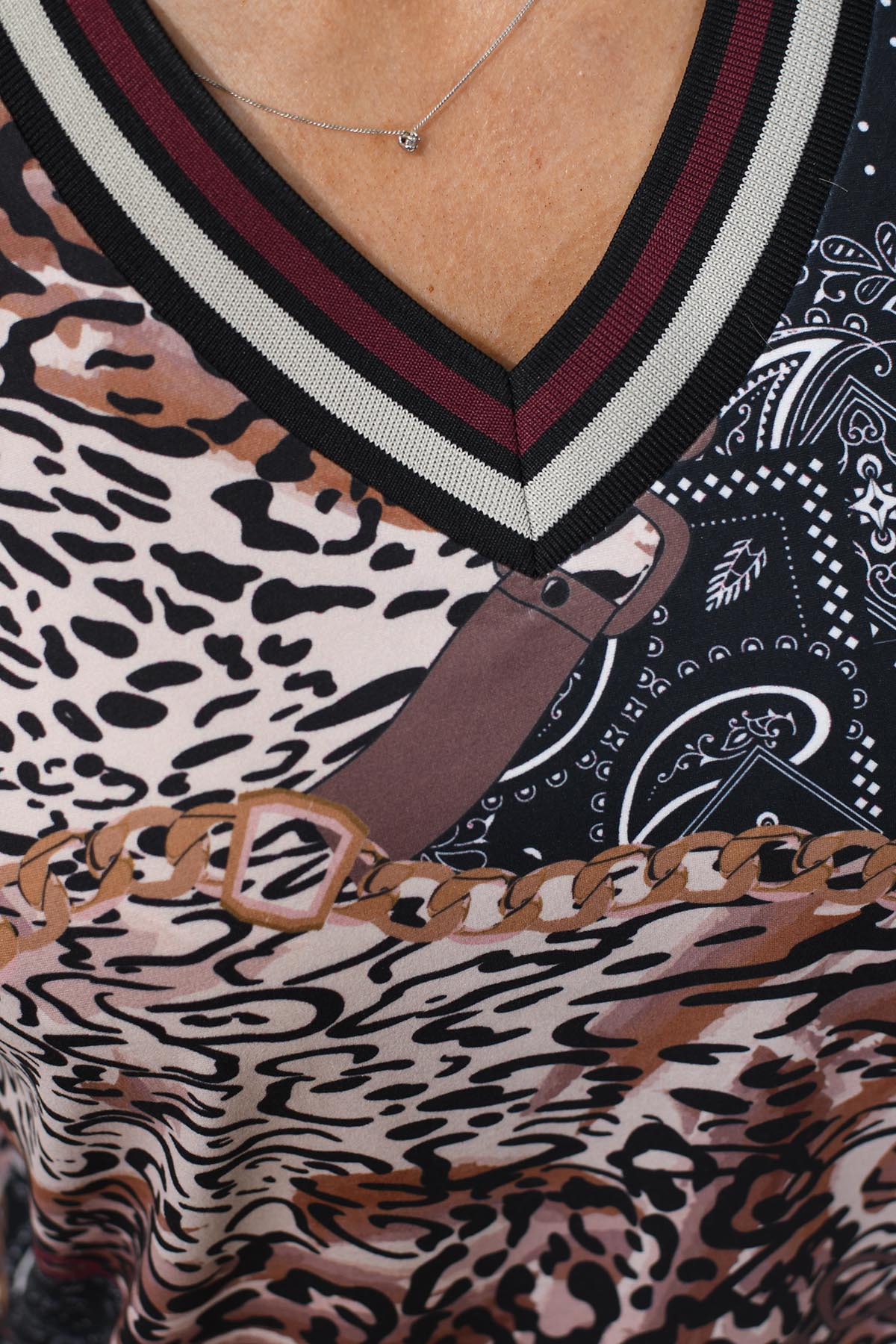 YEW Black, Burgundy & Tan Mixed Print Top- 3825 Bell