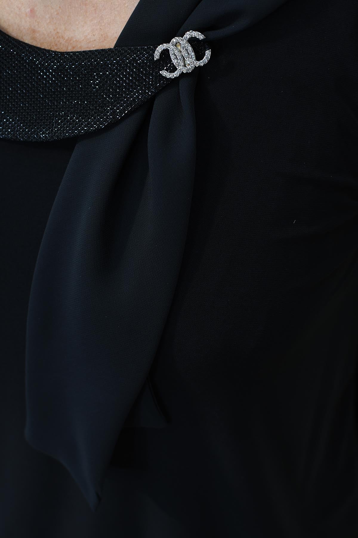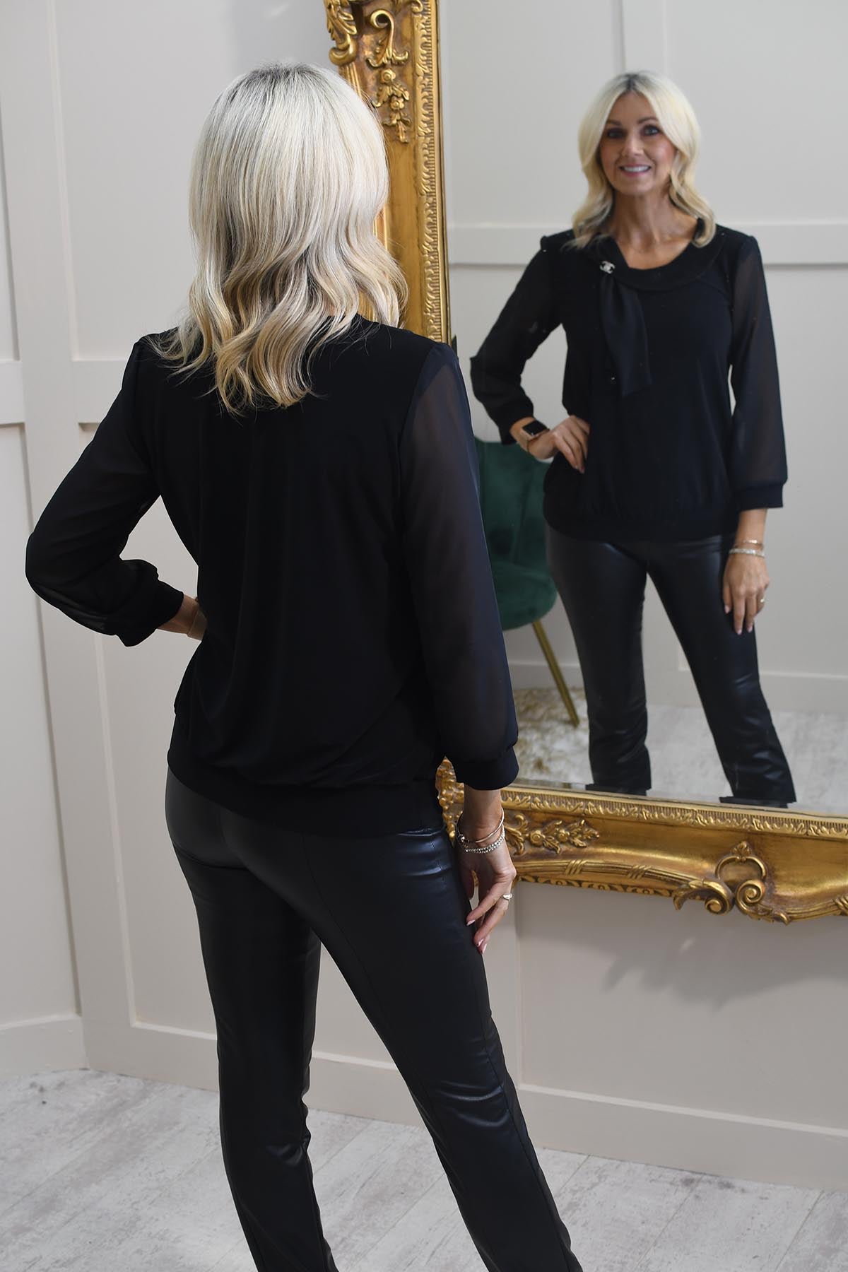 YEW Black Top With Sparkle Neckline & Sheer Sleeve- 2807 Aubrey