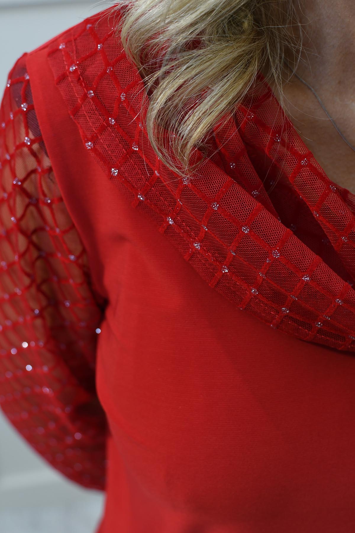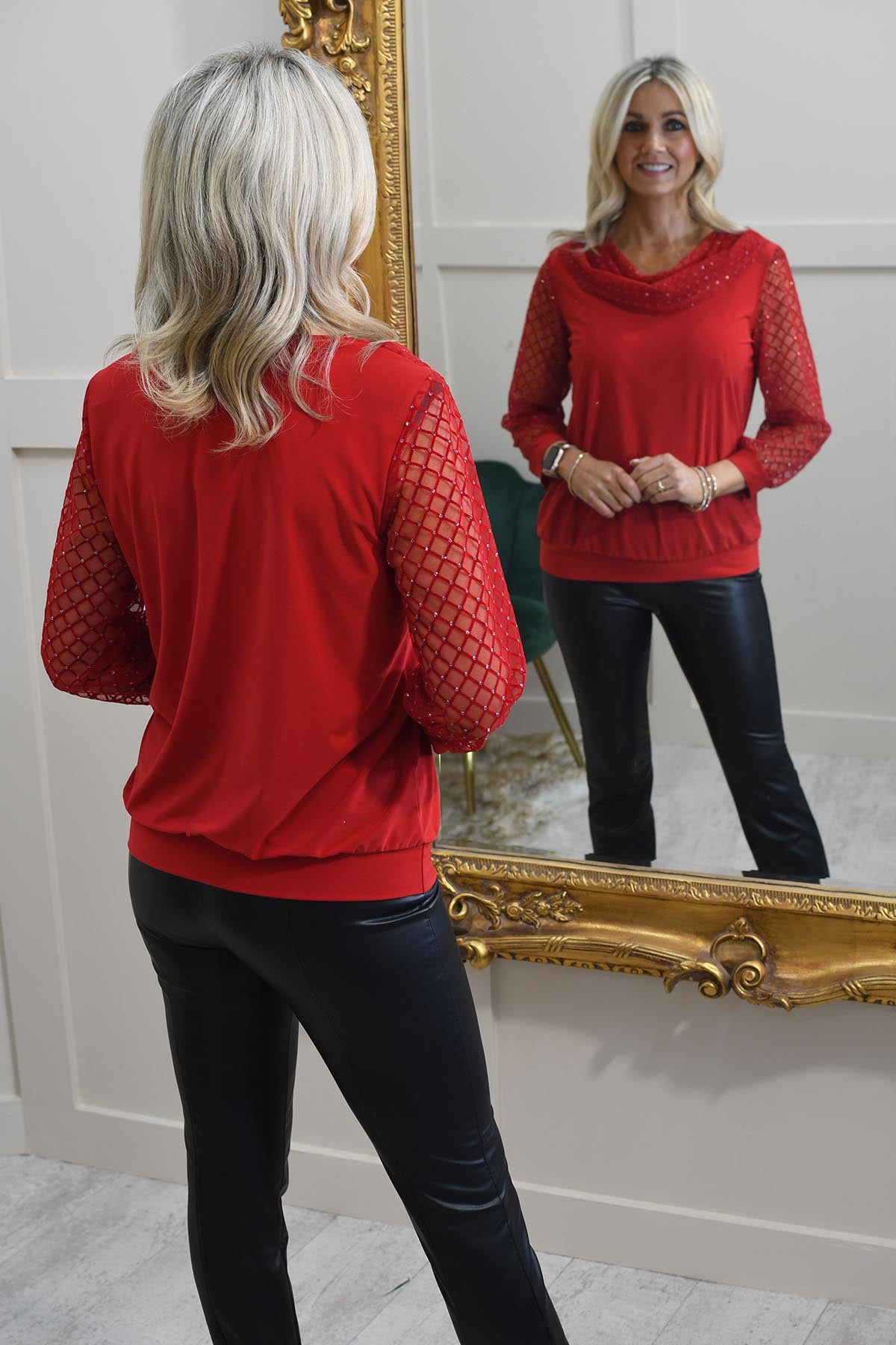 YEW Ruby Red Cowl Neck Top With Sheer Sparkle Sleeve -2647 Kirby