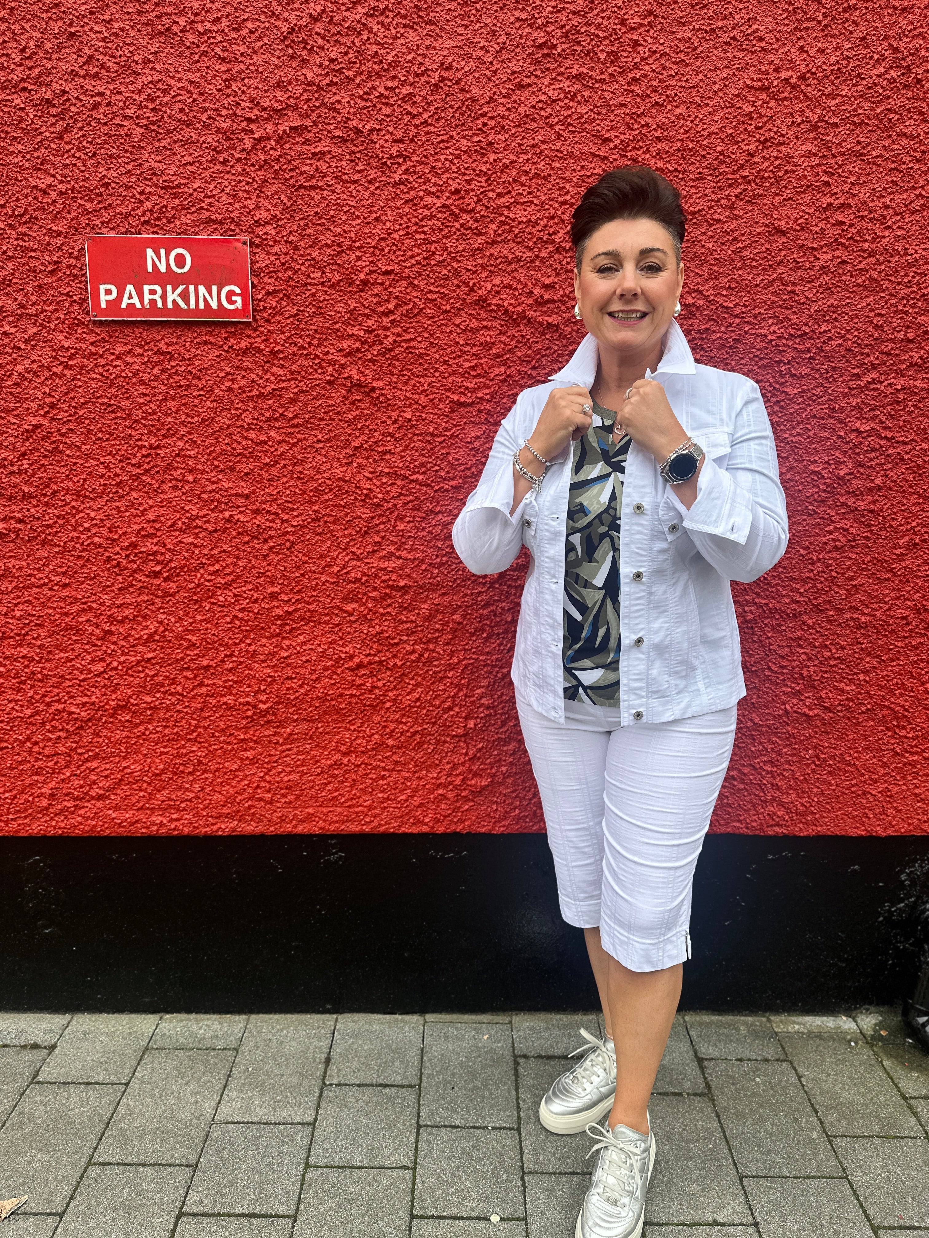 Morag begann in einer wunderschönen weißen Robell-Hose und einem Rabe-Top! Dieses lässige und schicke Outfit ist perfekt für Einkaufsbummel oder Ausflüge an den Strand!