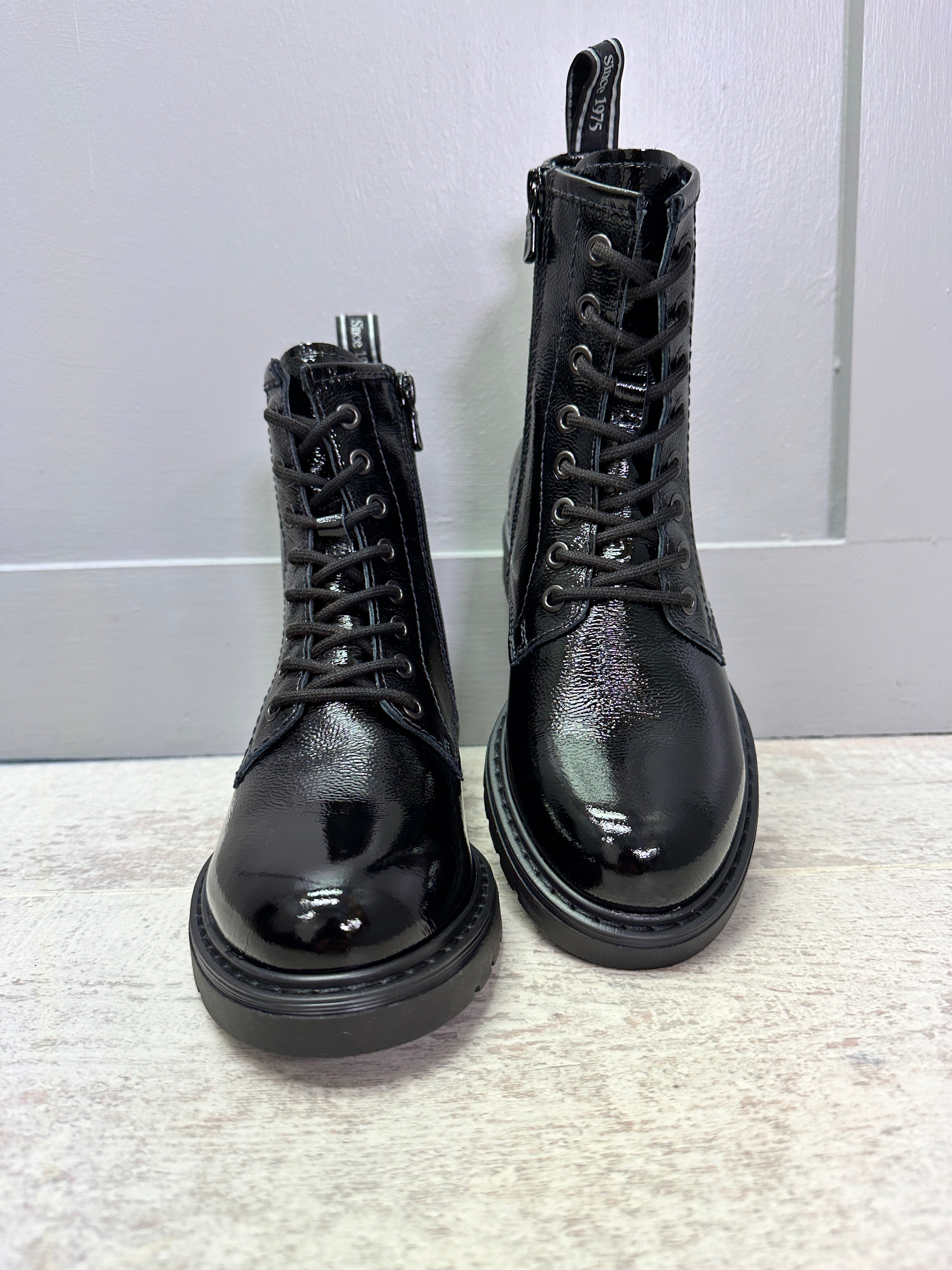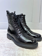 Die Stiefel sind ein stilvolles und zeitloses Schuhwerk, das die Schönheit von schwarzem Lackleder und den Komfort eines seitlichen Reißverschlusses zur Geltung bringt. Sein klassisches Design, der seitliche Reißverschluss und seine Vielseitigkeit machen ihn zu einer guten Wahl, um Ihrer Garderobe einen Hauch von Eleganz und Raffinesse zu verleihen.