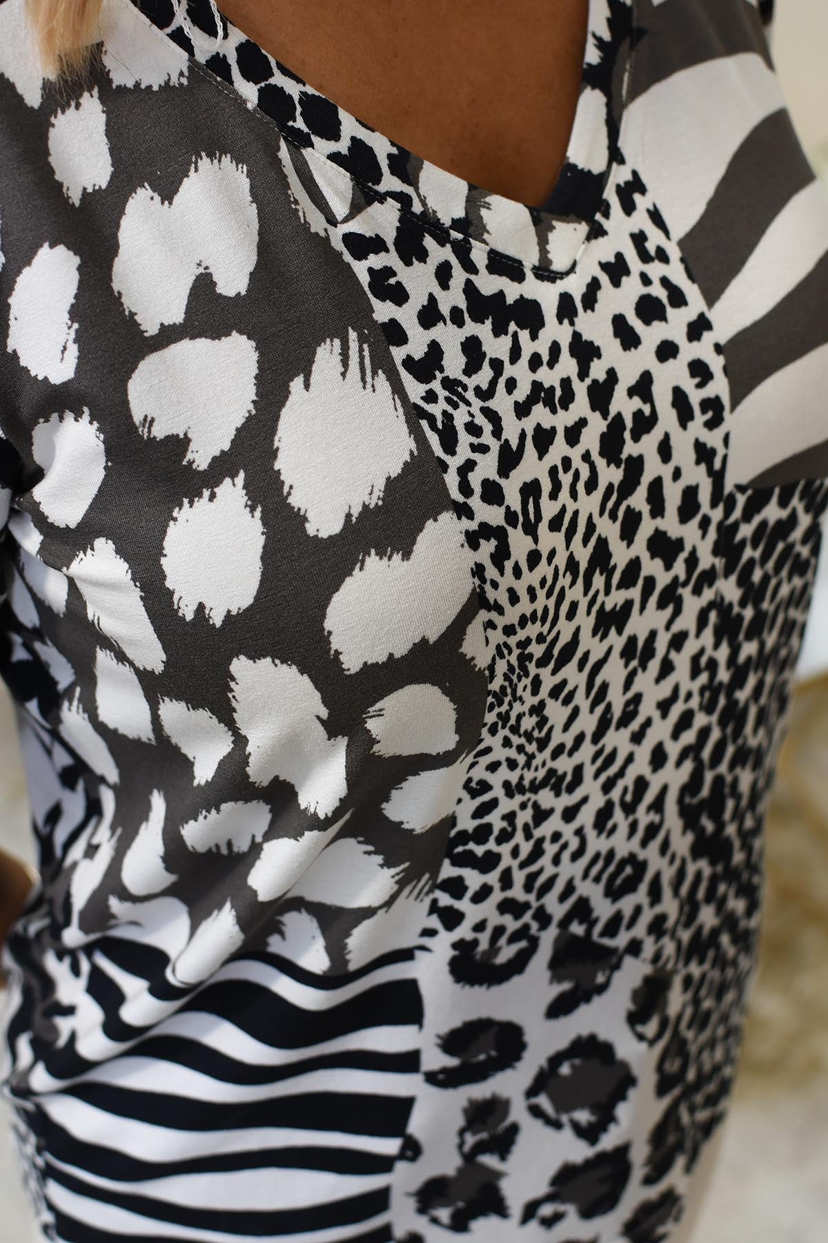 Elevate your everyday style with the I'CONA Black & Taupe Mixed Animal Print Top, a chic casual essential crafted from a soft, breathable blend of 96% viscose and 4% elastane. Designed for all-day comfort, this lightweight top features an eye-catching mixed animal print in elegant black and taupe tones, perfect for adding a statement touch to your wardrobe. The flattering silhouette and stretch fabric offer a perfect fit, ideal for versatile styling from work to weekend. A standout piece for fashion-forward individuals, this top combines trend-savvy design with effortless wearability.