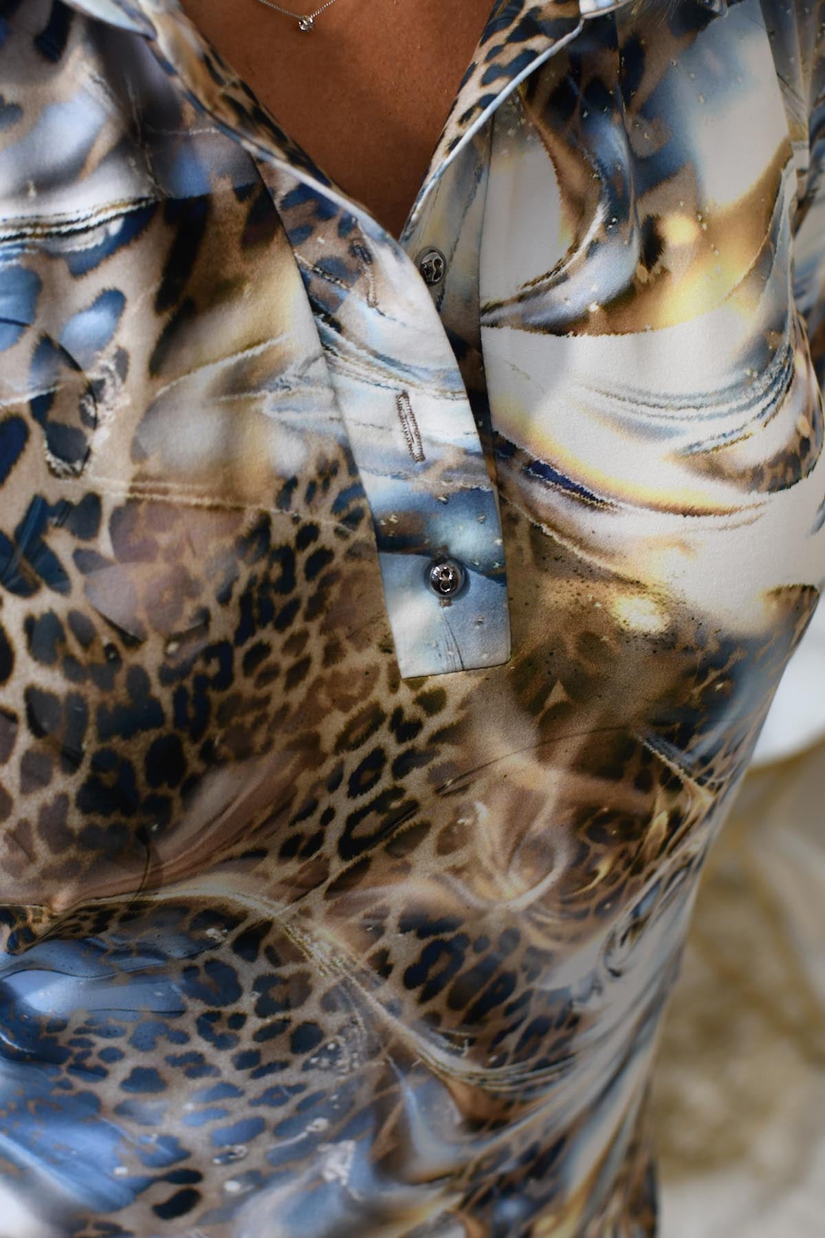YEW Bronze & Blue Animal Print 1/4 Button Blouse- 3743 Kat