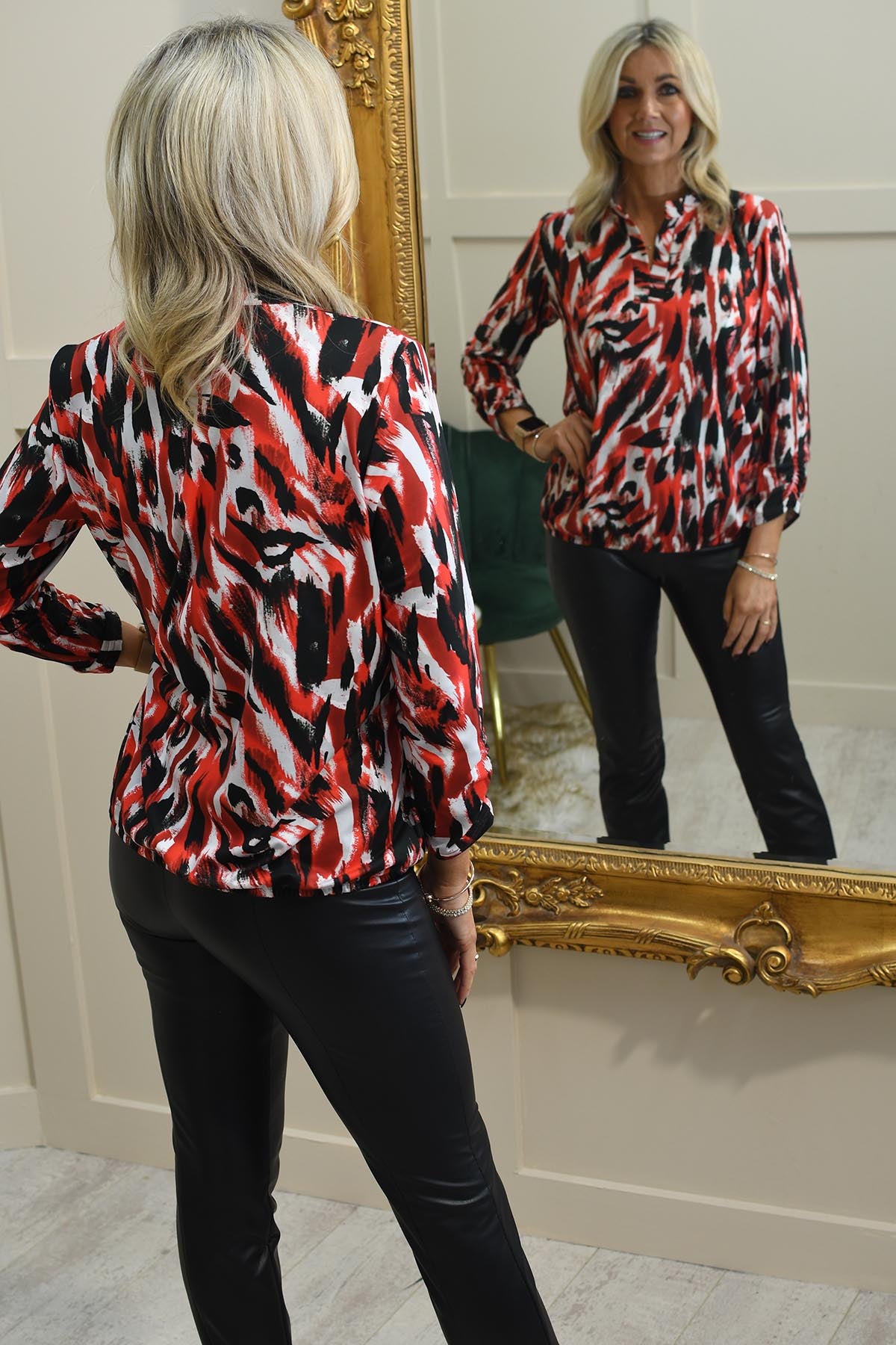 Ziehen Sie mit dem YEW-Top mit V-Ausschnitt und rotem und schwarzem abstraktem Druck alle Blicke auf sich, eine perfekte Mischung aus Stil und Komfort. Der kräftige abstrakte Druck in Rot und Schwarz verleiht einen modernen Touch, während der V-Ausschnitt einen Hauch von Eleganz verleiht. Dieses Top mit elastischem Bund schmeichelt Ihrer Silhouette, indem es eine wunderschön definierte Form schafft. Es ist aus leichtem, hochwertigem Stoff gefertigt und eignet sich ideal für den ganzen Tag, egal ob im Büro oder bei einem lässigen Ausflug. Kombinieren Sie es mit Röcken oder Hosen für einen schicken, vielseitigen Look, der zu jedem Anlass passt.