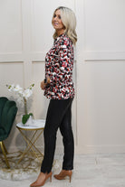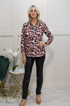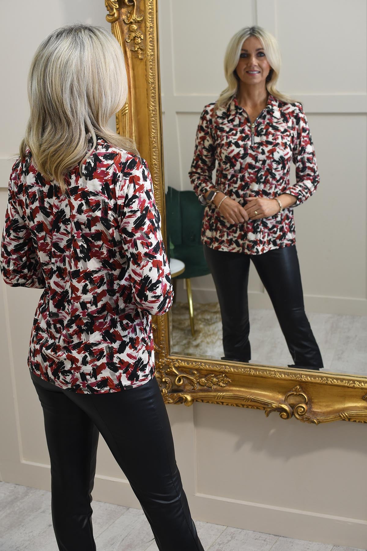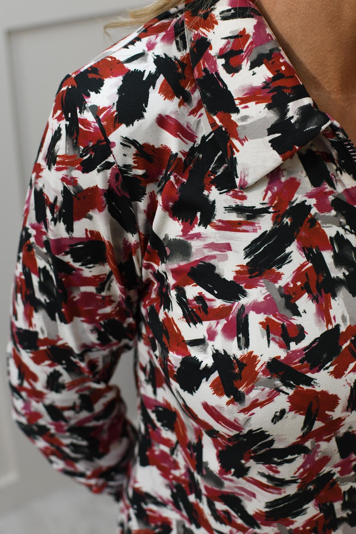 YEW Oberteil mit 1/4-Reißverschluss und abstraktem Druck in Rot, Schwarz und Creme – 3861 Poppy