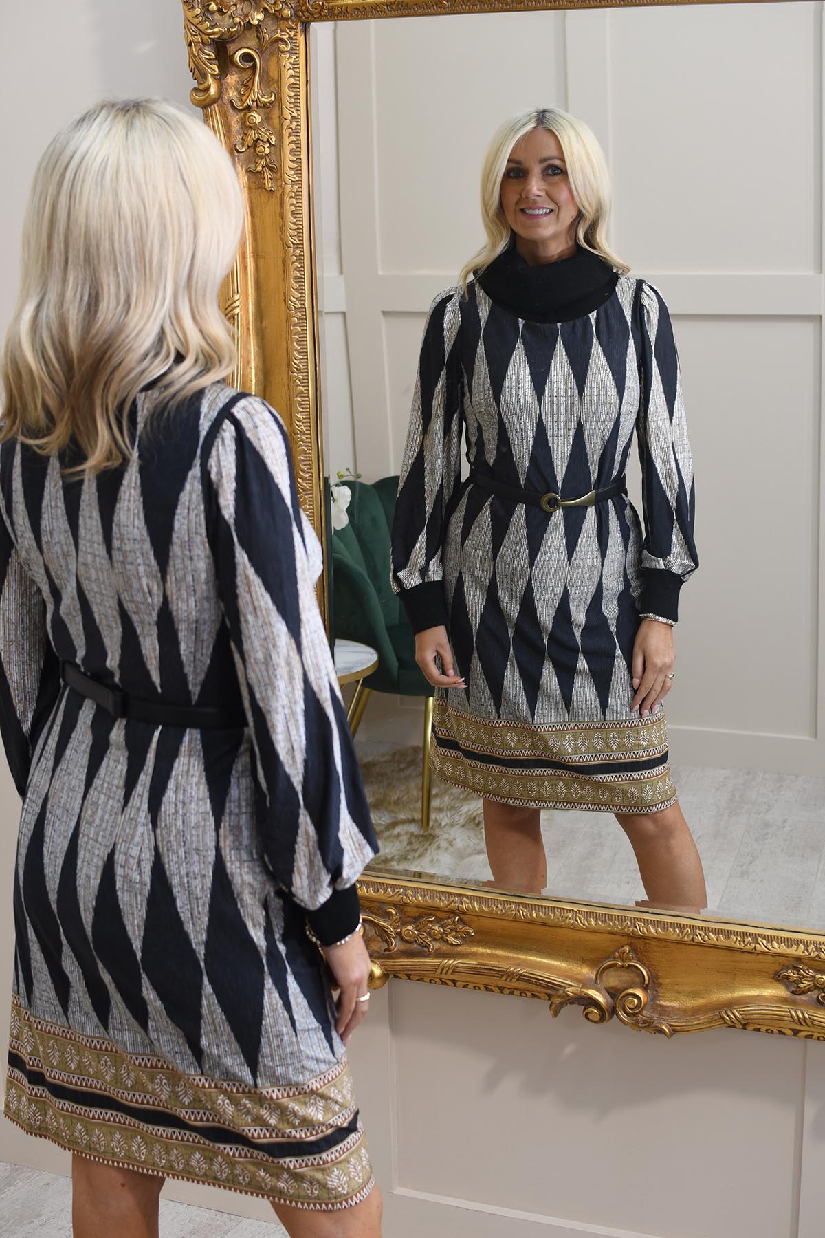 K.Design – Kurzes Rollkragenkleid mit Rautenmuster in Schwarz und Beige – 2339