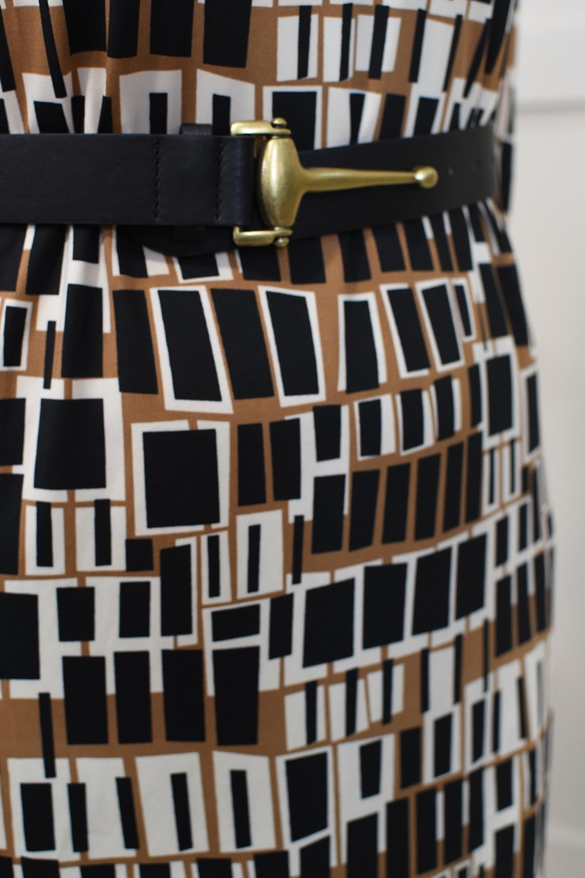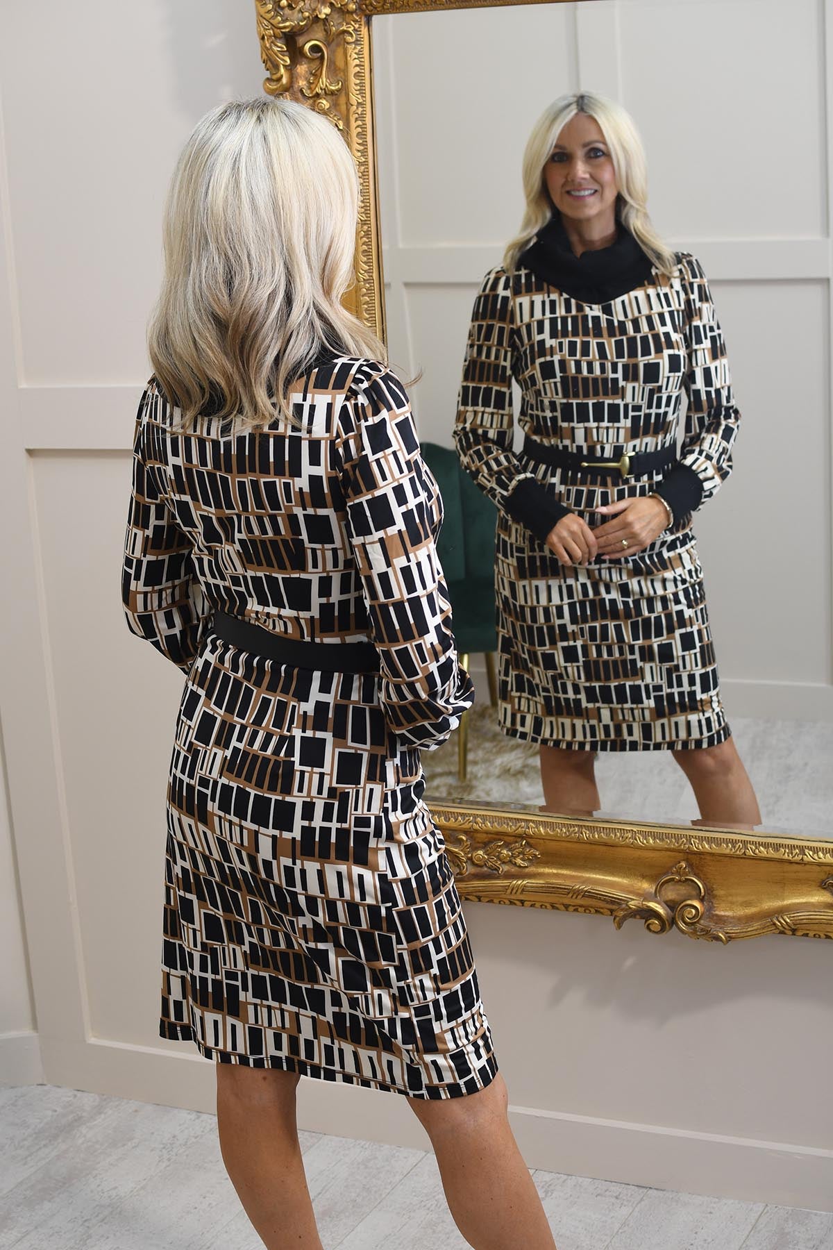 K.Design – Rollkragenkleid mit Gürtel und Aufdruck in Schwarz, Hellbraun und Beige – Z369