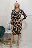 K.Design – Kleid mit Tierstreifen in Marineblau, Senfgelb und Rostrot und Knotentaille – Z224