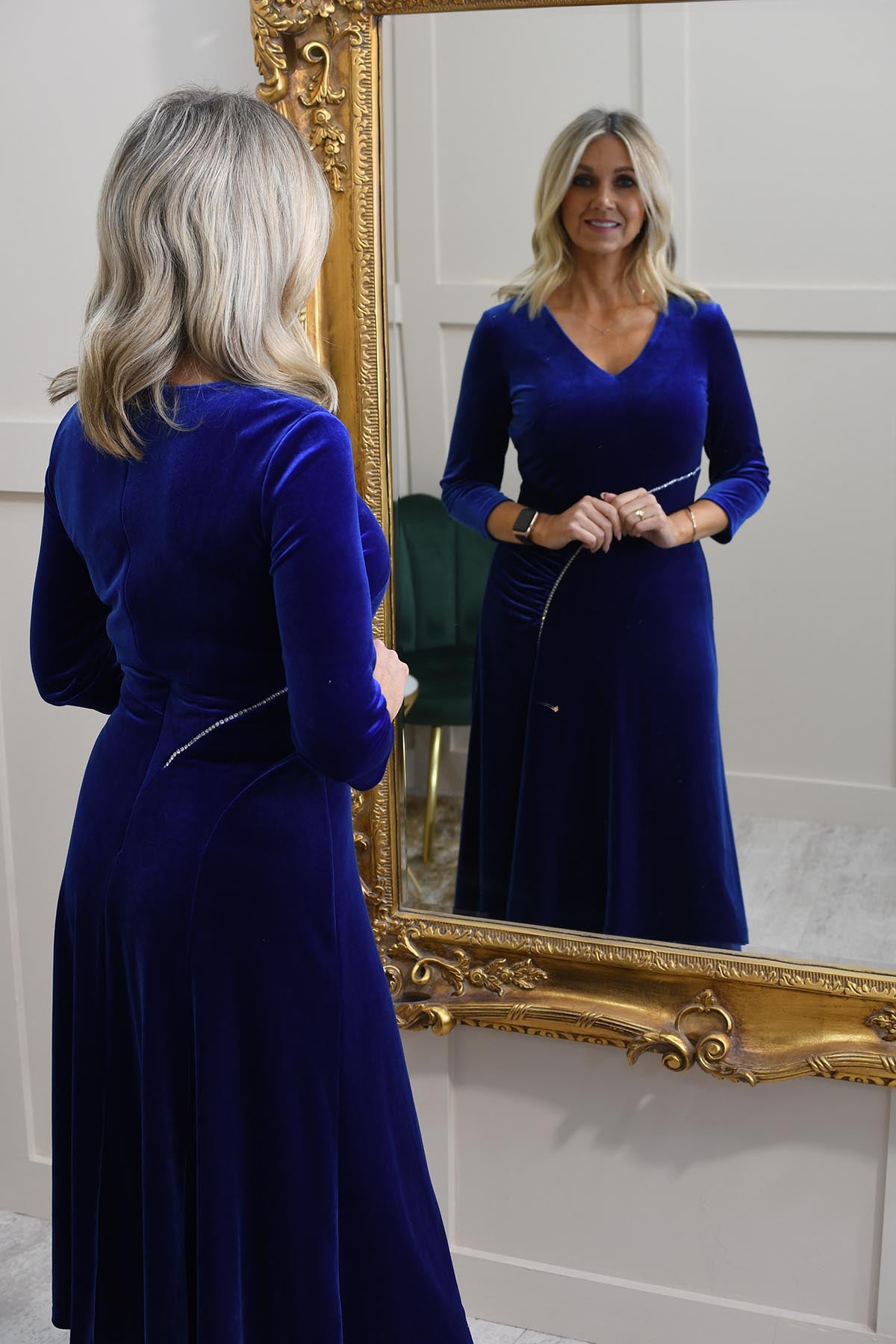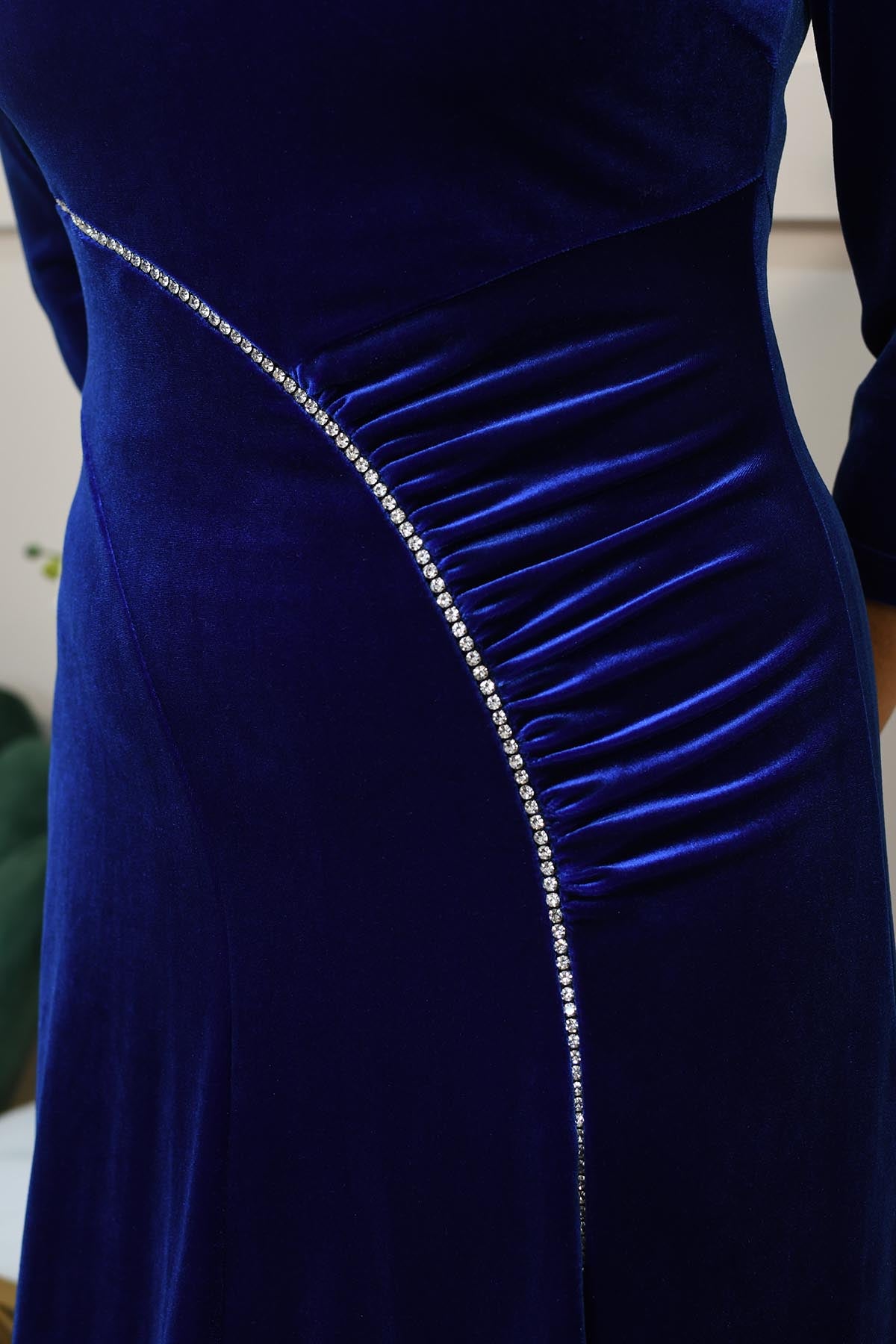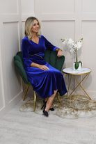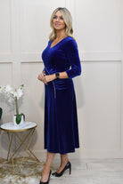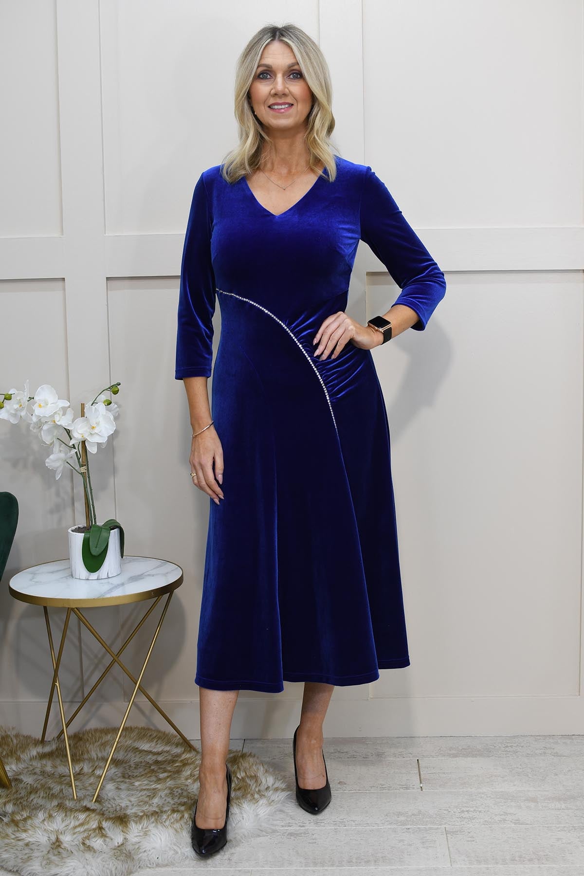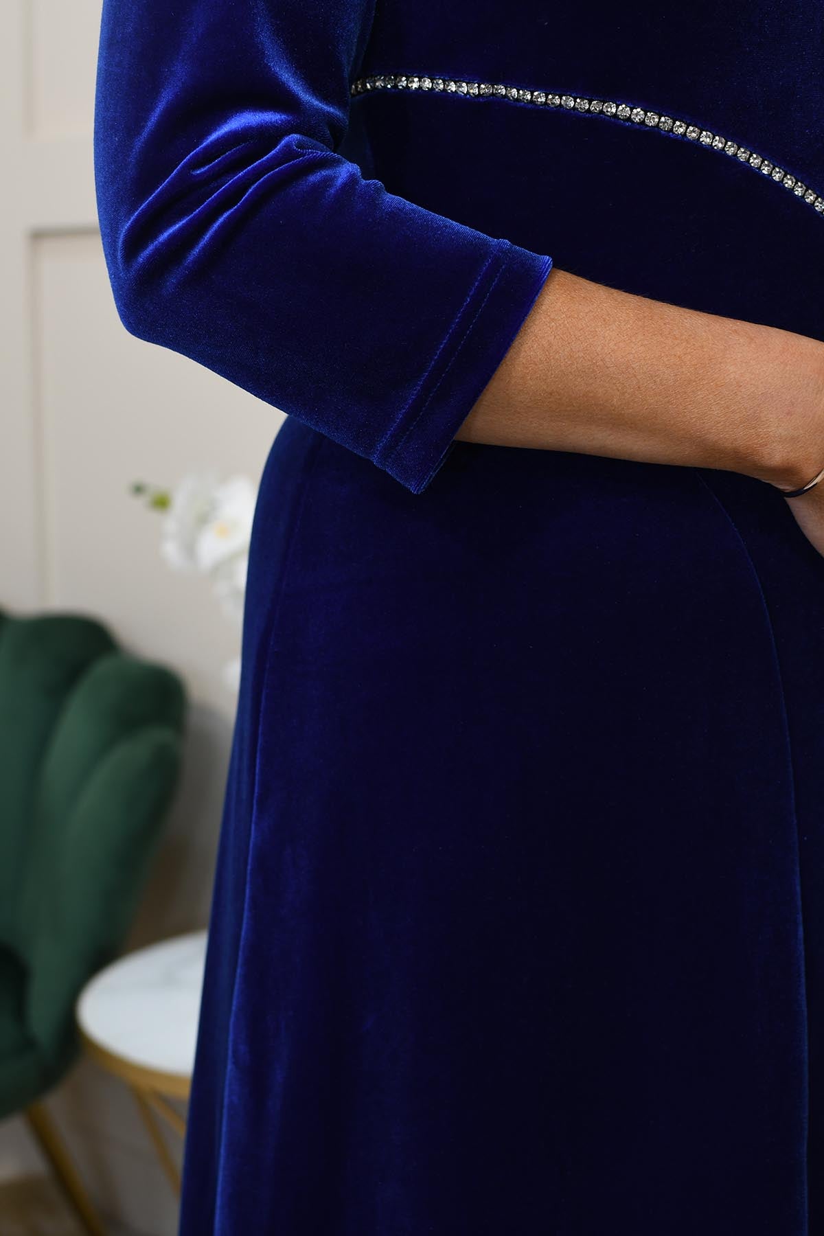 Tia Velvet Dress with Rushed side and Diamante Trim -Royal Blue 78111