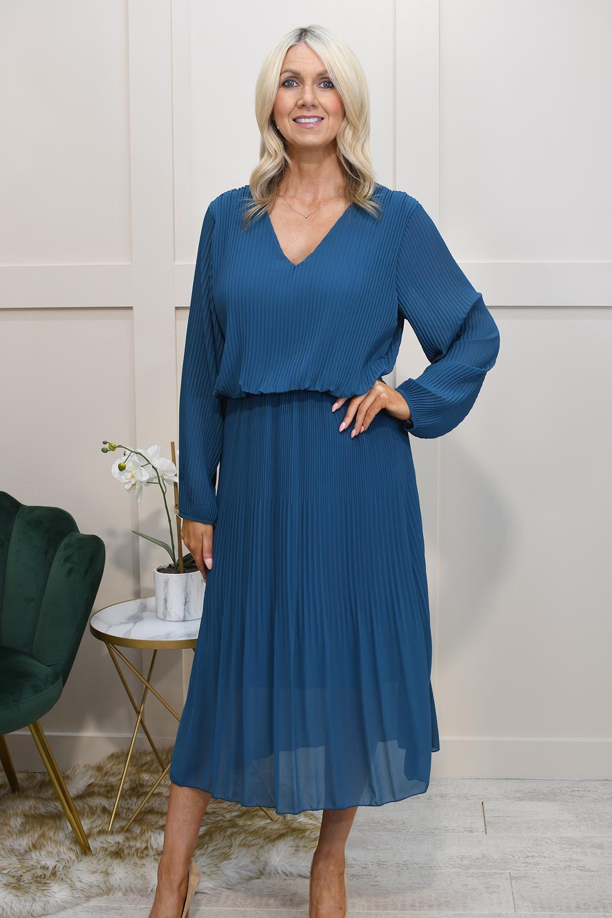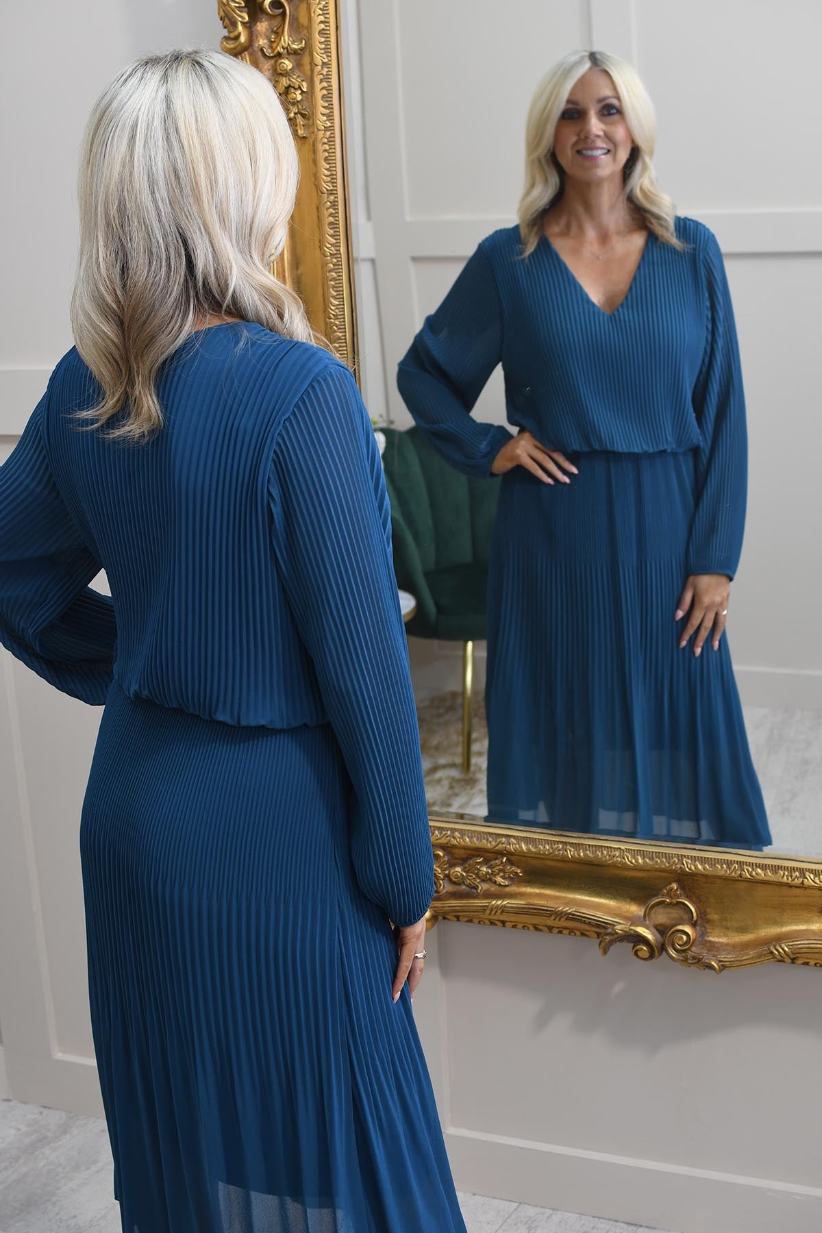 Das Kyla Teal Plisse Dress ist ein atemberaubendes und elegantes Stück, perfekt für ein starkes Statement. Dieses Kleid besteht aus einem luxuriösen Plissee-Stoff, der weiche, strukturierte Falten erzeugt und dem Design Dimension und Bewegung verleiht. Der lebendige Blaugrünton bietet einen auffälligen und anspruchsvollen Look, ideal für Tagesveranstaltungen und Abendveranstaltungen. Mit seiner schmeichelhaften, fließenden Silhouette und dem mühelosen Fall bietet dieses Kleid sowohl Stil als auch Komfort. Das raffinierte Design wird durch einen anmutigen Ausschnitt und einen fließenden Saum ergänzt, was es zu einer vielseitigen Option für jeden besonderen Anlass macht.