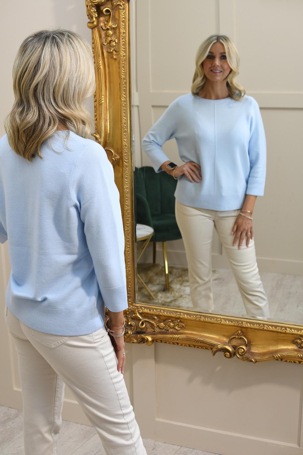 Embrace effortless elegance with the Rabe Powder Blue Fine Knit Sweater. Crafted from a soft, lightweight knit, this sweater offers exceptional comfort with a refined, sophisticated look. The delicate powder blue hue adds a fresh, feminine touch, perfect for any season. Designed with a classic round neckline and long sleeves, it provides a flattering, relaxed fit that’s ideal for layering or wearing on its own. Whether paired with jeans for casual chic or dressed up with tailored trousers, this versatile sweater is a must-have for your wardrobe. Timeless style meets everyday comfort in this beautiful knitwear piece.