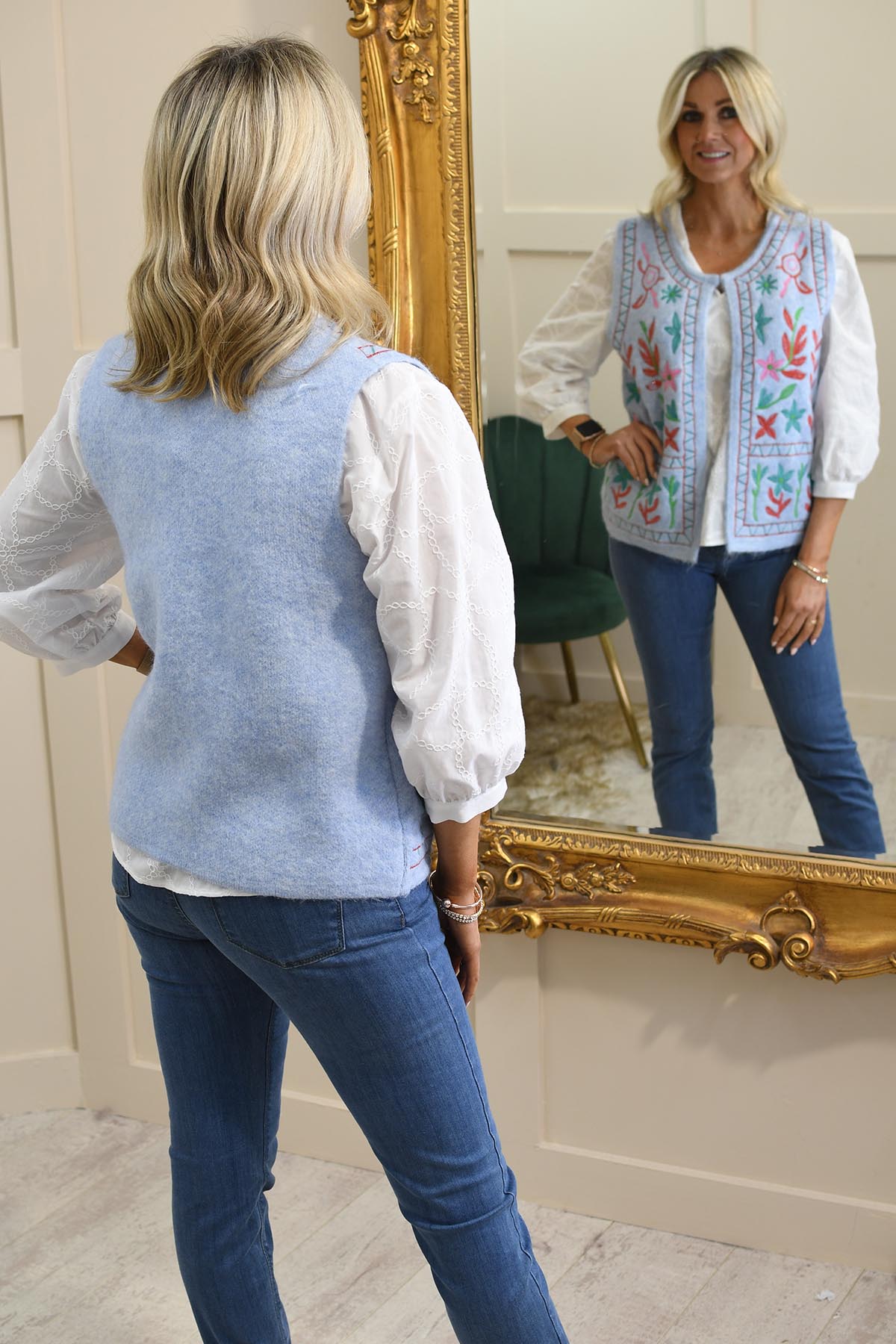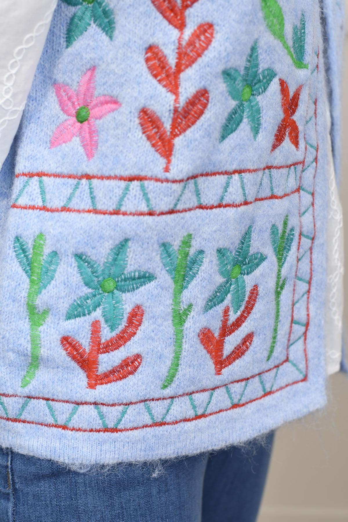 Kyla Powder Blue Knit Sweater Vest With Floral Embroidery- PT10013