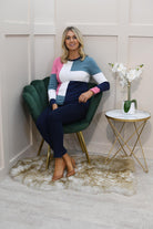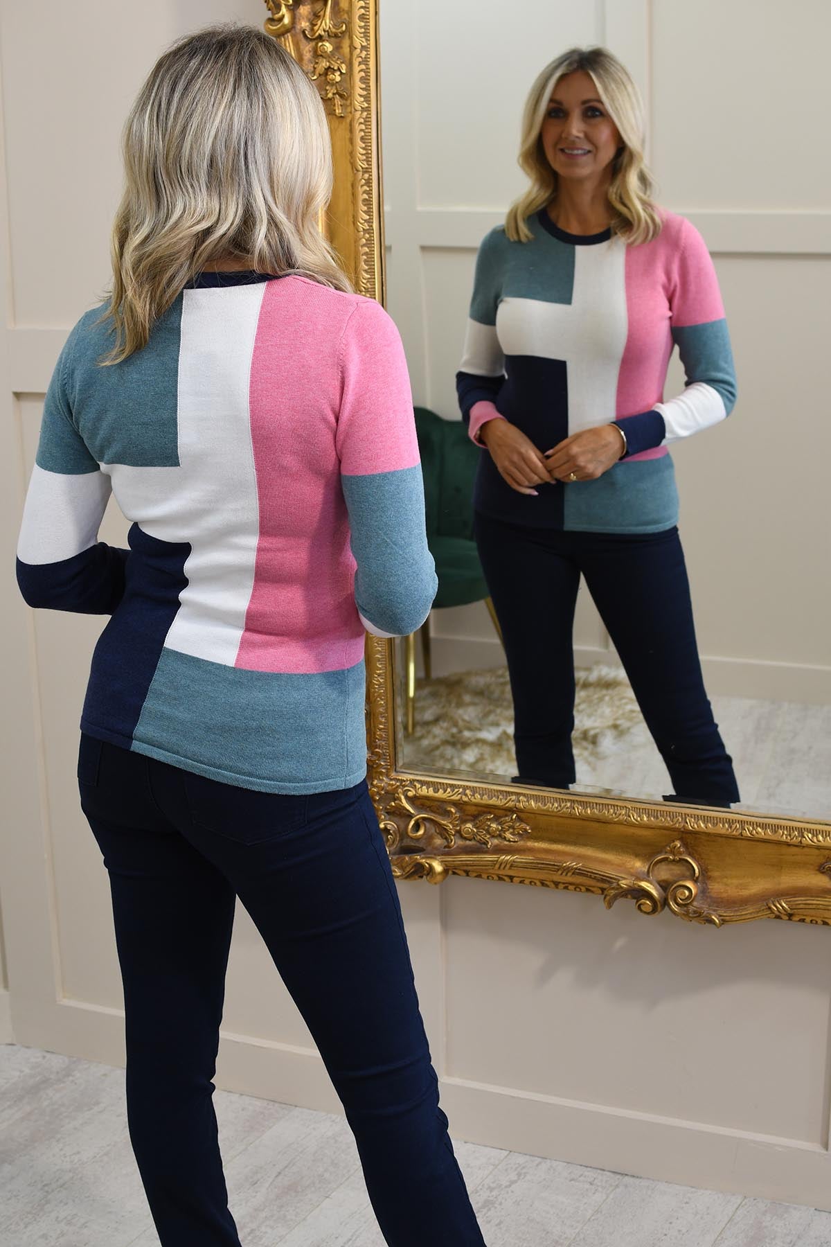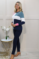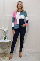 Elevate your casual wardrobe with this Marble Block Pattern Sweater in soft teal, rose, and navy, crafted from 100% cotton for all-day comfort. The striking block design blends soft tones with bold contrast, creating a modern yet timeless piece that’s perfect for effortless styling. Made from breathable, natural cotton, this sweater offers a cosy feel while remaining lightweight, making it ideal for layering in any season. Its relaxed fit and versatile colour palette make it easy to pair with jeans, trousers, or skirts. A chic everyday essential, this knit adds both comfort and sophistication to your casual collection.