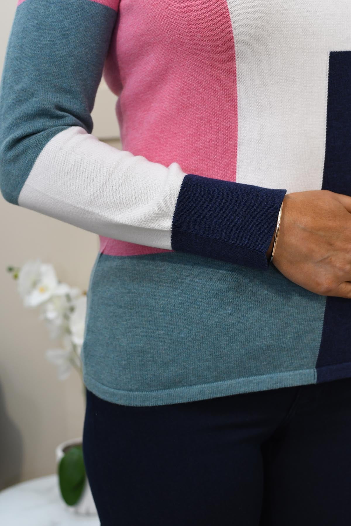 Marble-Block Pattern Sweater- Soft Teal, Rose & Navy-8055 230