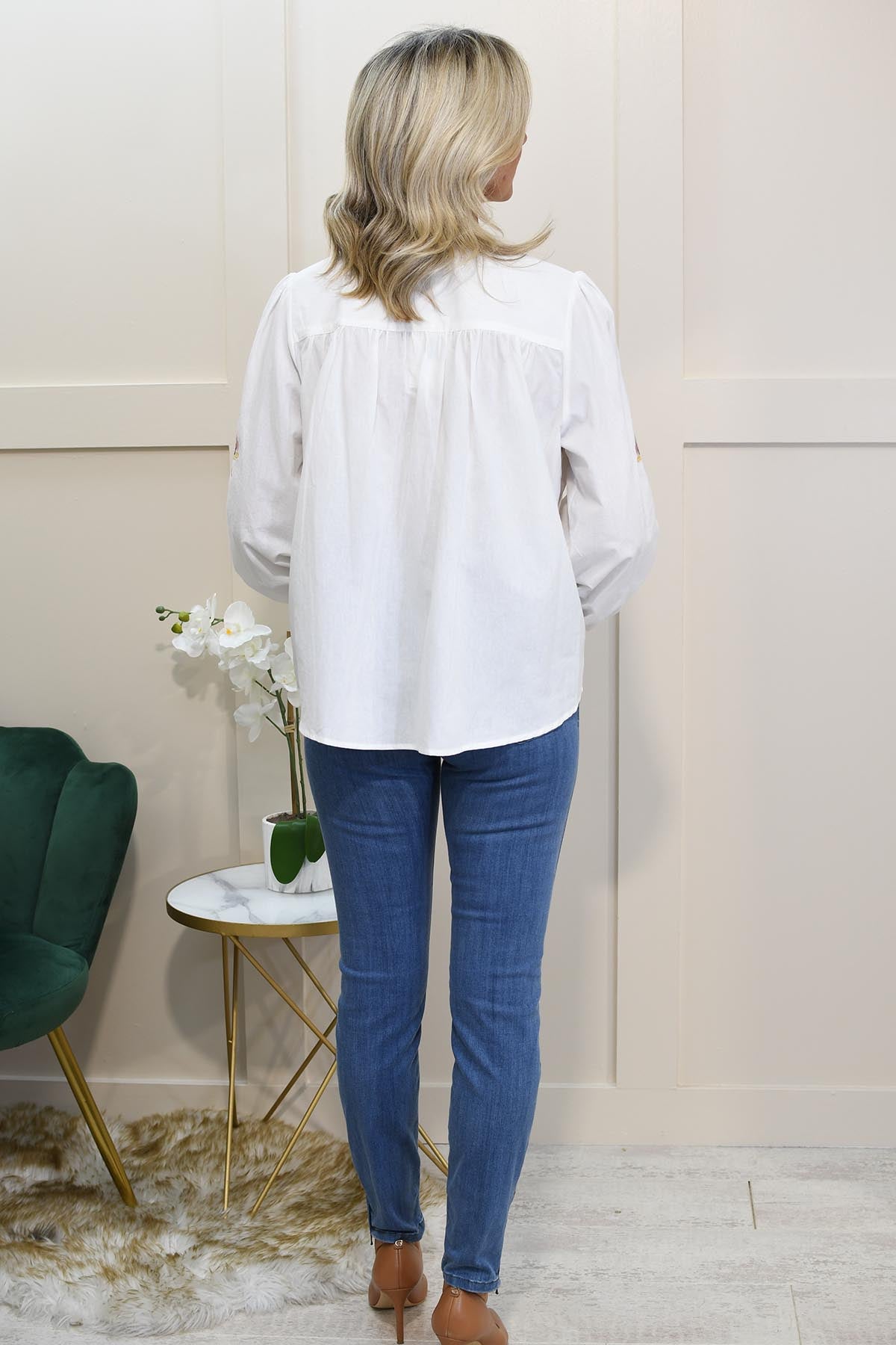 Musy Muse White Shirt With Floral Embroidered Detail & Tan Trim-M602-1
