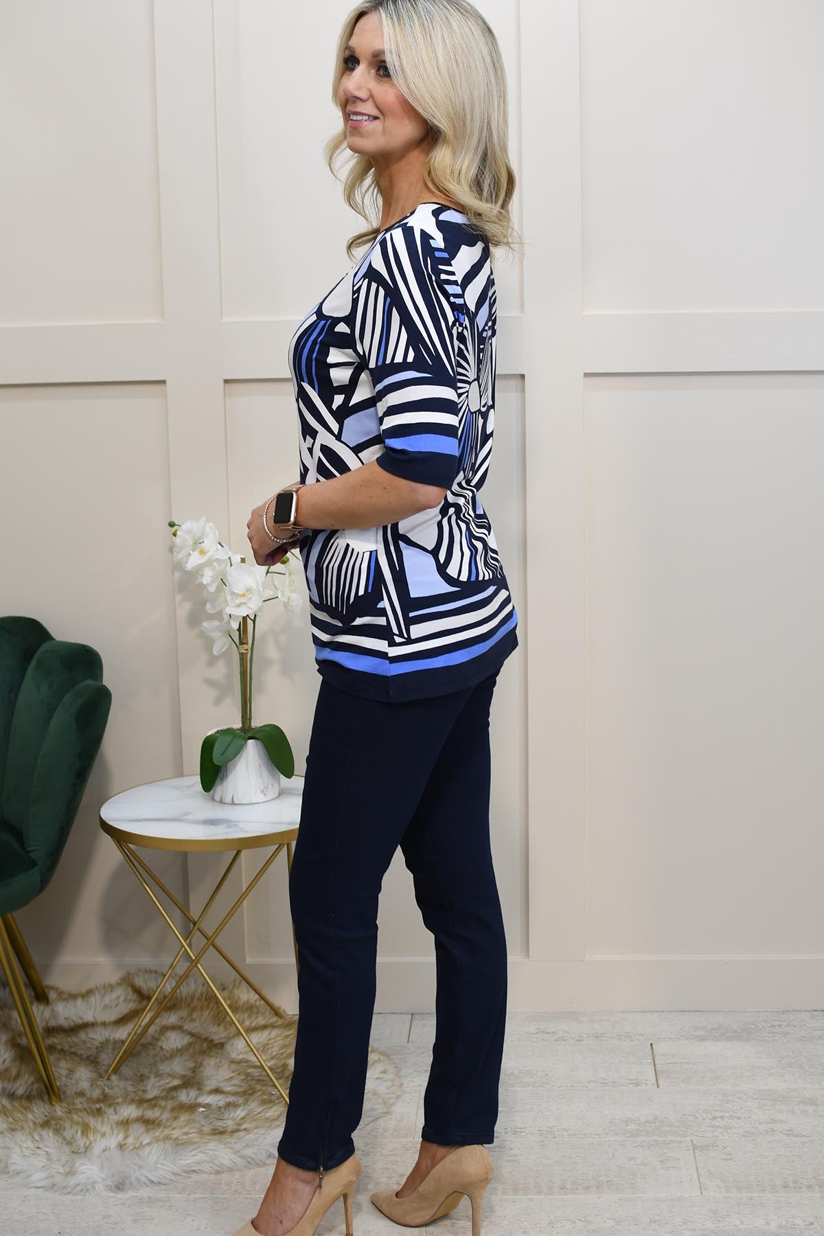 Embrace effortless summer style with the Barbara Lebek Navy, Blue & Off-White Abstract Print Top. Crafted from 92% viscose and 8% elastane, this lightweight top offers superior breathability and a comfortable, stretchy fit. The abstract print design in navy, blue, and off-white adds a contemporary touch, perfect for casual summer outings. Its soft, smooth fabric feels great against the skin, keeping you cool and stylish on warmer days. Pair this versatile piece with jeans or shorts for a chic, everyday look. Enhance your summer wardrobe with this Barbara Lebek top, blending comfort, practicality, and eye-catching style seamlessly.