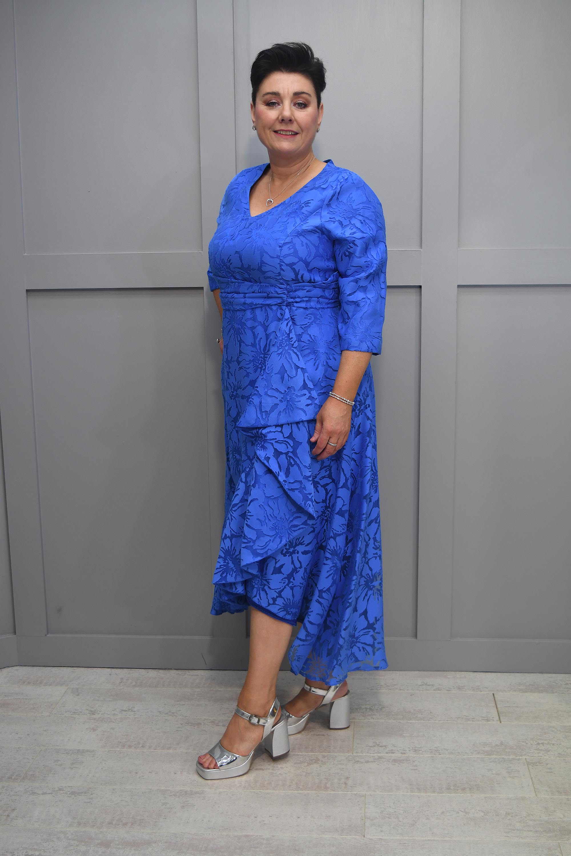 Cassandra, königsblaues Blumenkleid mit seitlichen Rüschen und Broschendetail – Cal 929