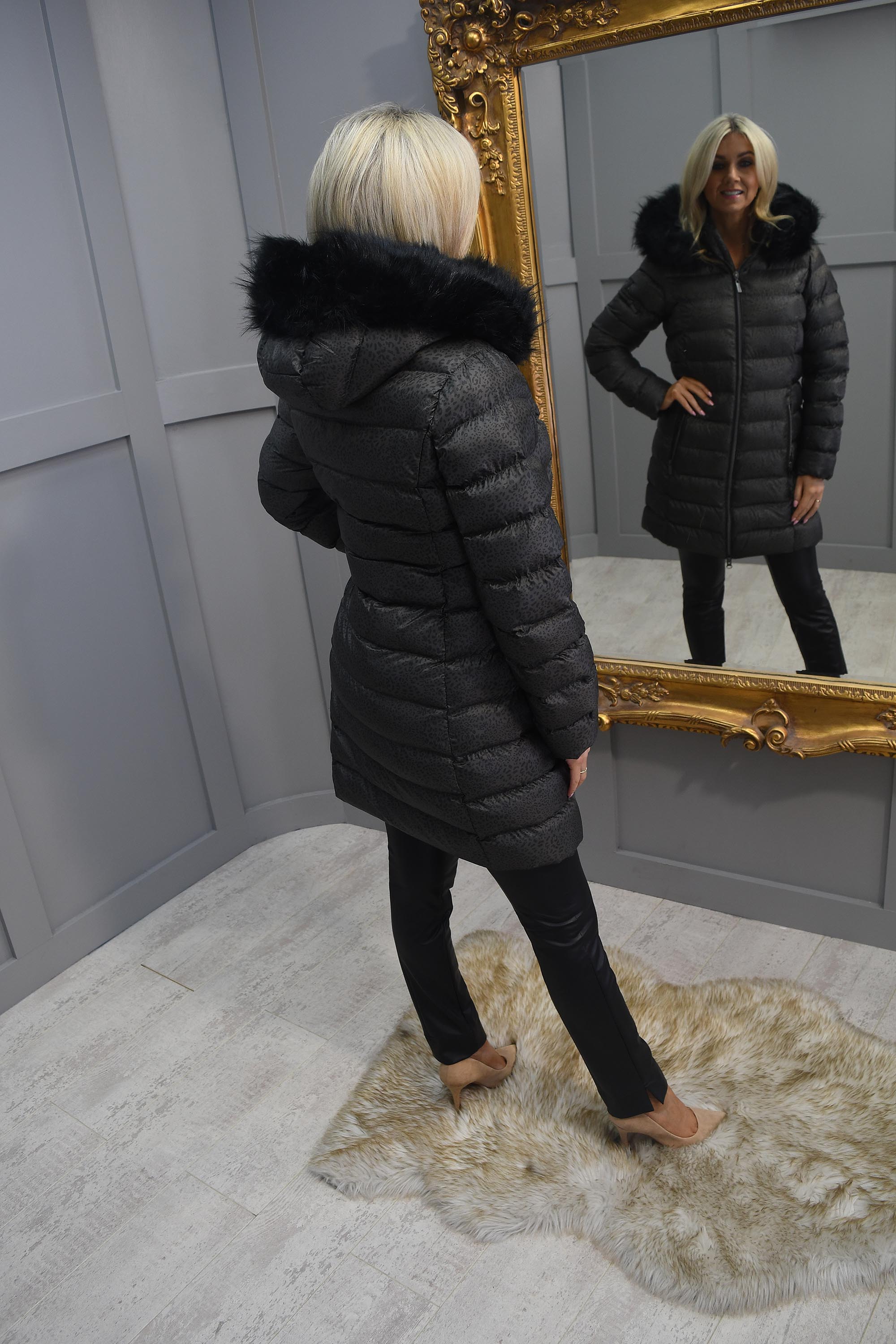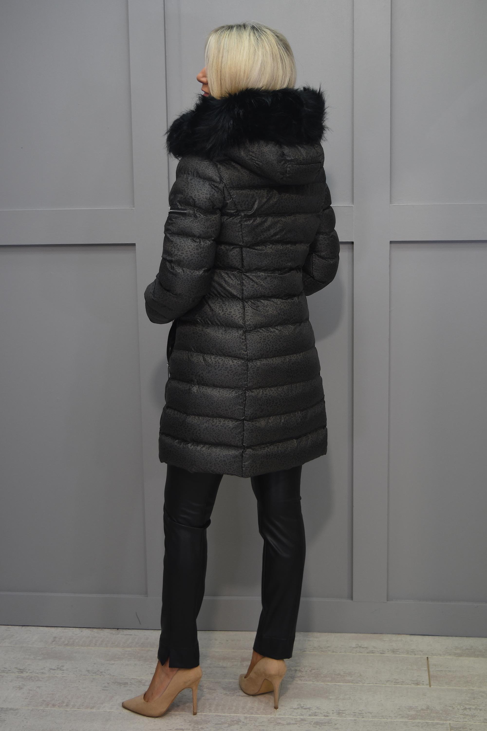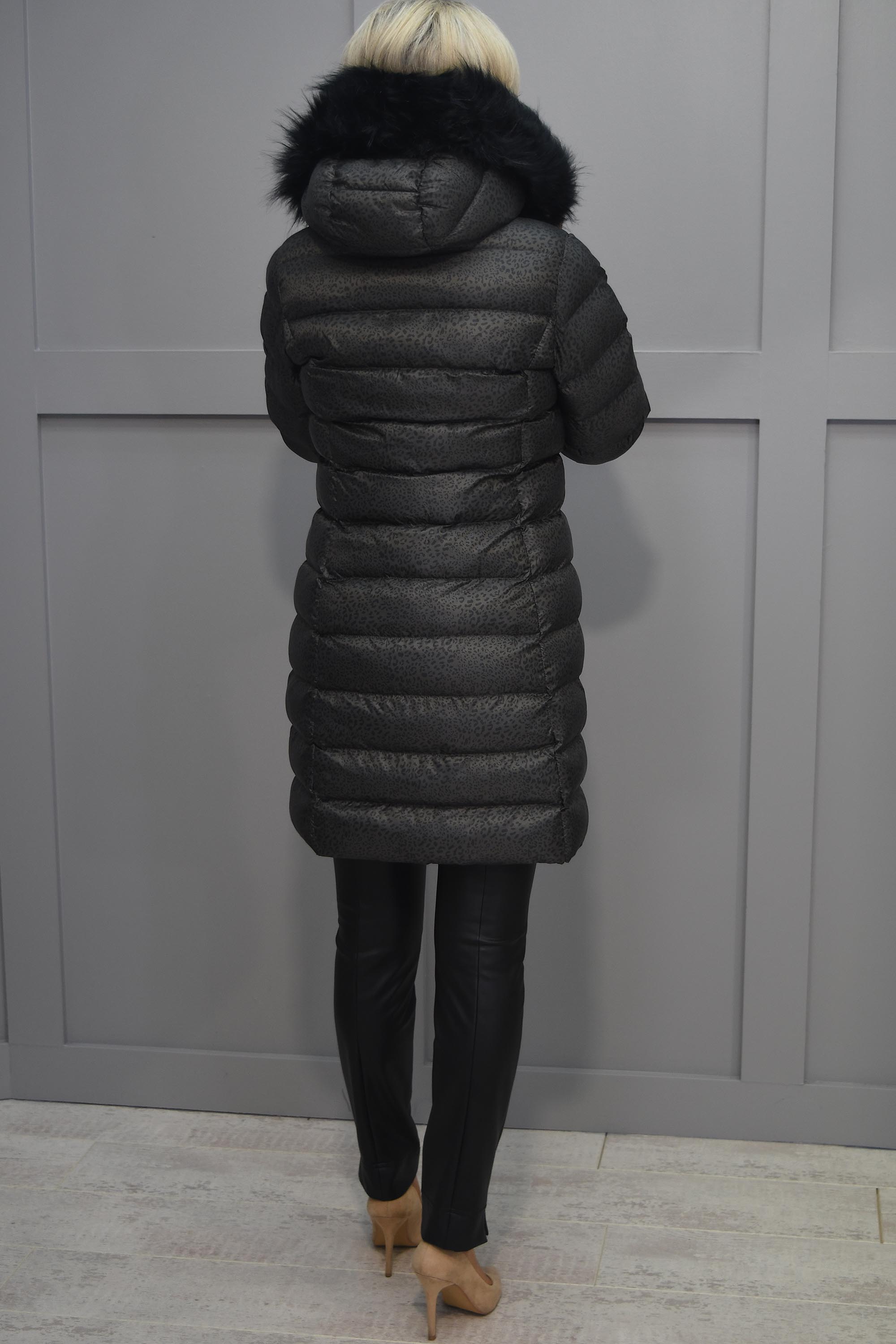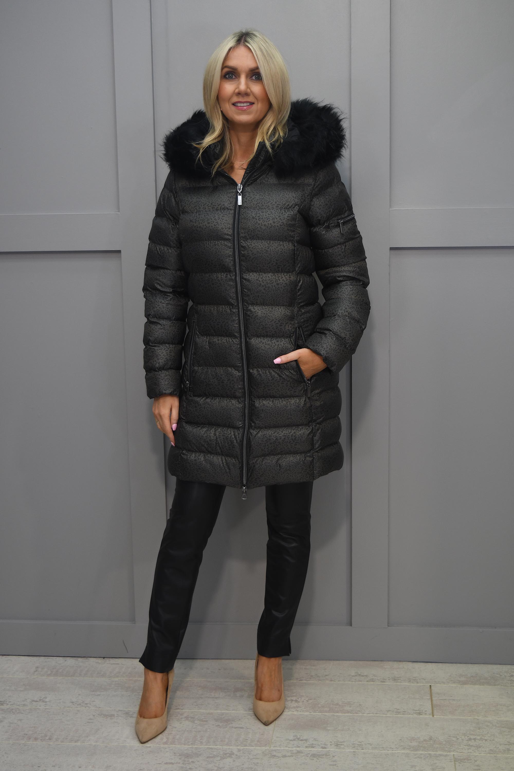 Der wattierte Mantel „Army Green Animal Print“ von Etage ist ein trendiger und stylischer Wintermantel in Armeegrün mit einem auffälligen Animalprint-Muster.