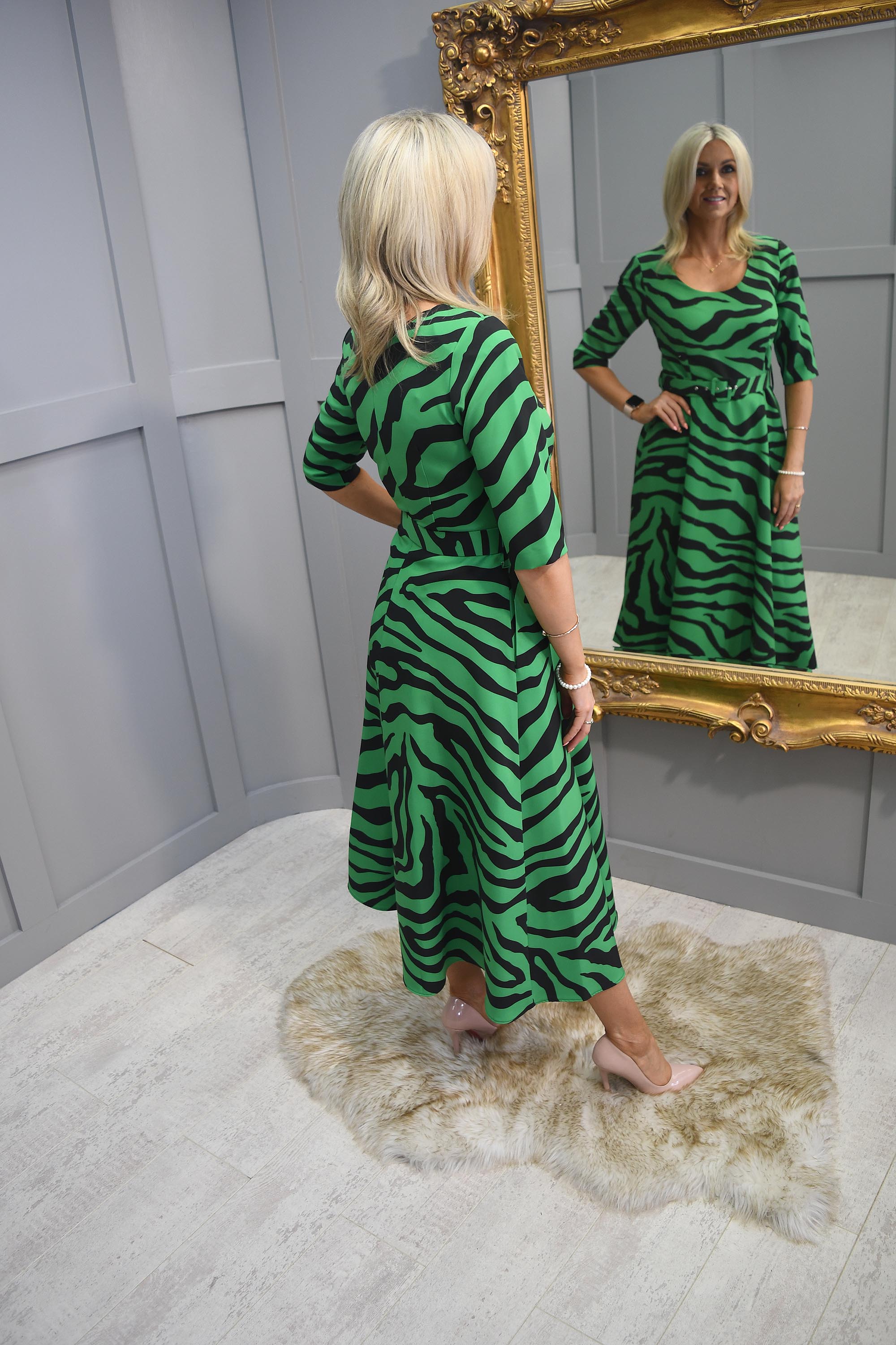 Dieses Kleid eignet sich perfekt für verschiedene Anlässe, von Tagesveranstaltungen bis hin zu Abendveranstaltungen. Die Kombination aus grünem und schwarzem Druck, der A-Linien-Silhouette und dem passenden Gürtel machen es zu einer herausragenden Wahl, die Selbstvertrauen und Individualität ausstrahlt.