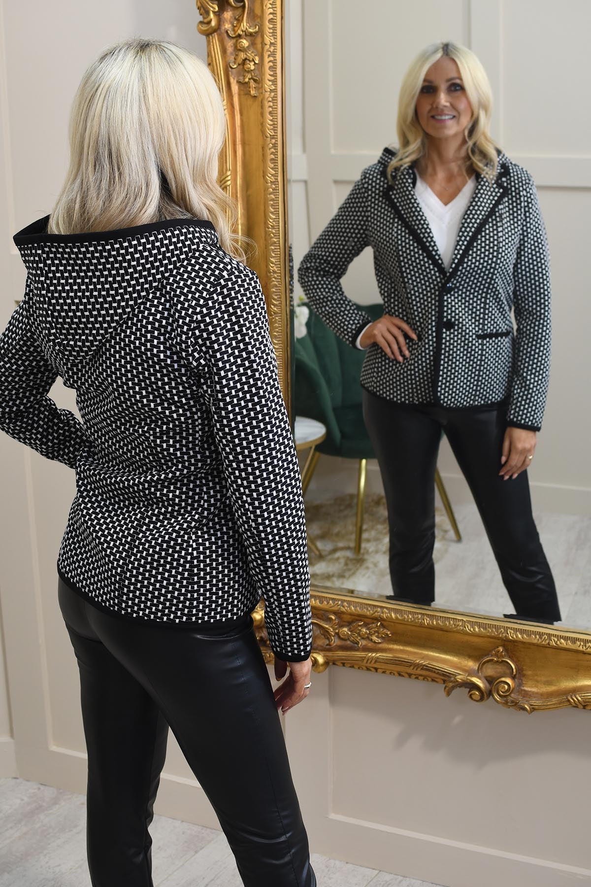 Der Dolcezza Monochrome Blazer mit abnehmbarer Kapuze ist ein vielseitiges und stilvolles Stück, das klassische Schneiderkunst mit einem modernen, sportlichen Touch verbindet. Mit seinem schicken monochromen Design bietet dieser Blazer eine zeitlose Schwarz-Weiß-Palette, die jedem Outfit Eleganz verleiht. Die abnehmbare Kapuze fügt ein einzigartiges, praktisches Element hinzu und ermöglicht Ihnen einen mühelosen Übergang zwischen elegantem und lässigem Look. Mit seiner maßgeschneiderten Passform und dem hochwertigen Stoff sorgt dieser Blazer für Komfort und Eleganz. Er ist perfekt für den Arbeitsalltag und für Wochenendausflüge und ein Muss für alle, die Mode gerne mit Funktionalität kombinieren.