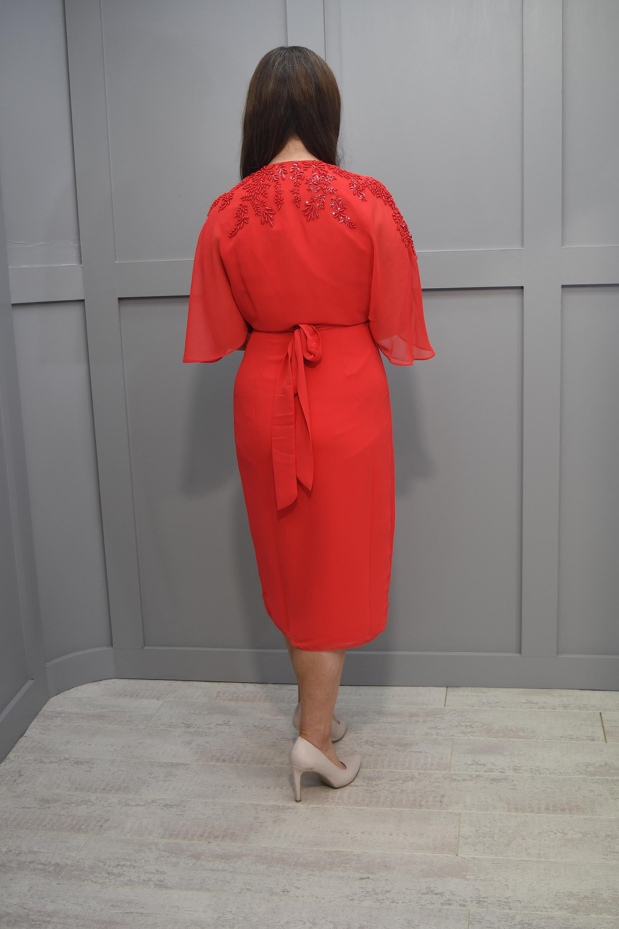 Hope & Ivy – Rotes, verziertes Midi-Wickelkleid mit drapierten Ärmeln und Bindegürtel – 7436 Jolie