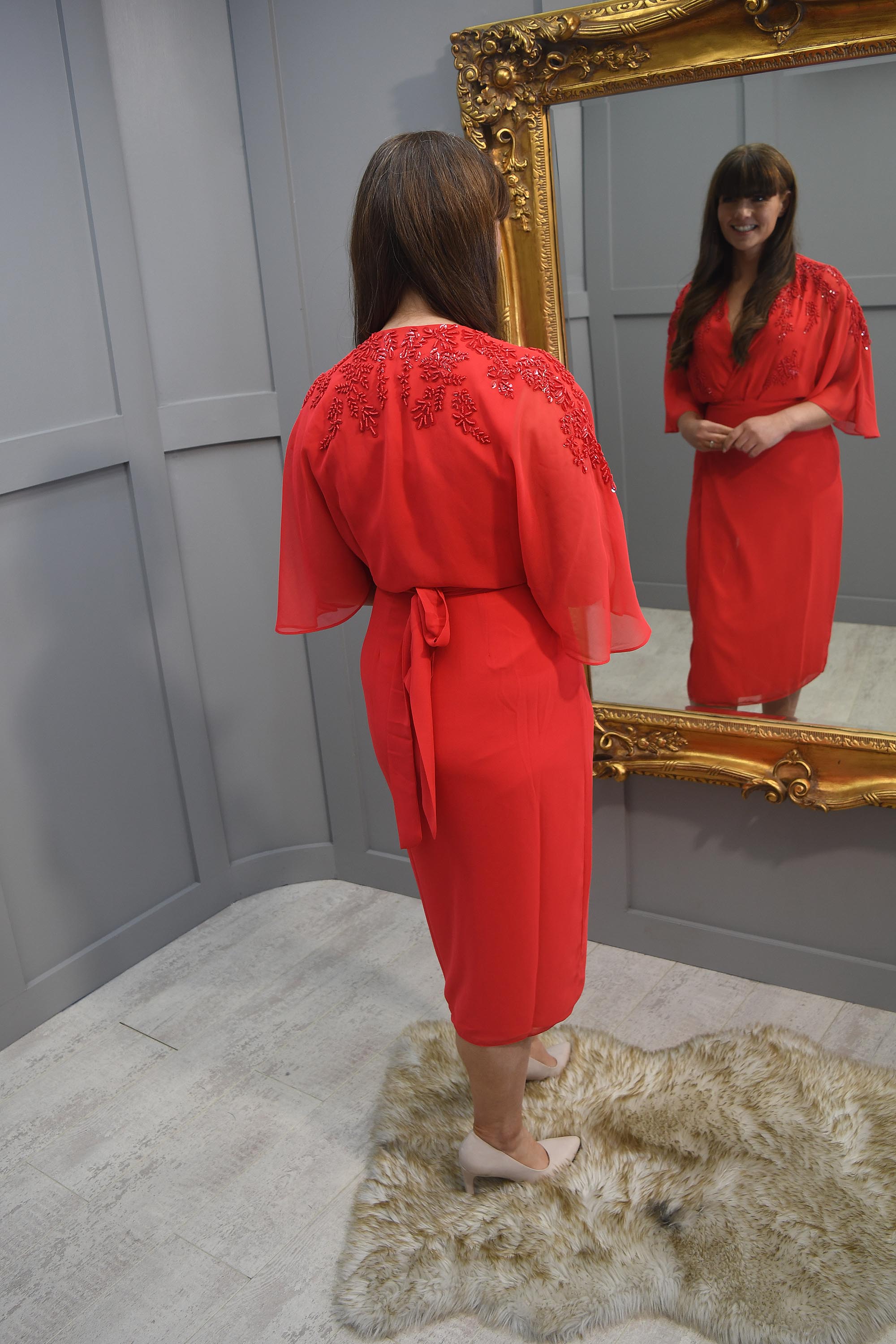 Das Kleid schmeichelt der Figur und hat eine taillierte Taille mit Bindedetail, sodass Sie die Passform individuell anpassen und Ihre Kurven mit Anmut und Haltung zur Geltung bringen können. Der fließende, mittellange Rock fällt elegant um den Körper und schafft eine Silhouette, die sowohl zeitlos als auch elegant ist.