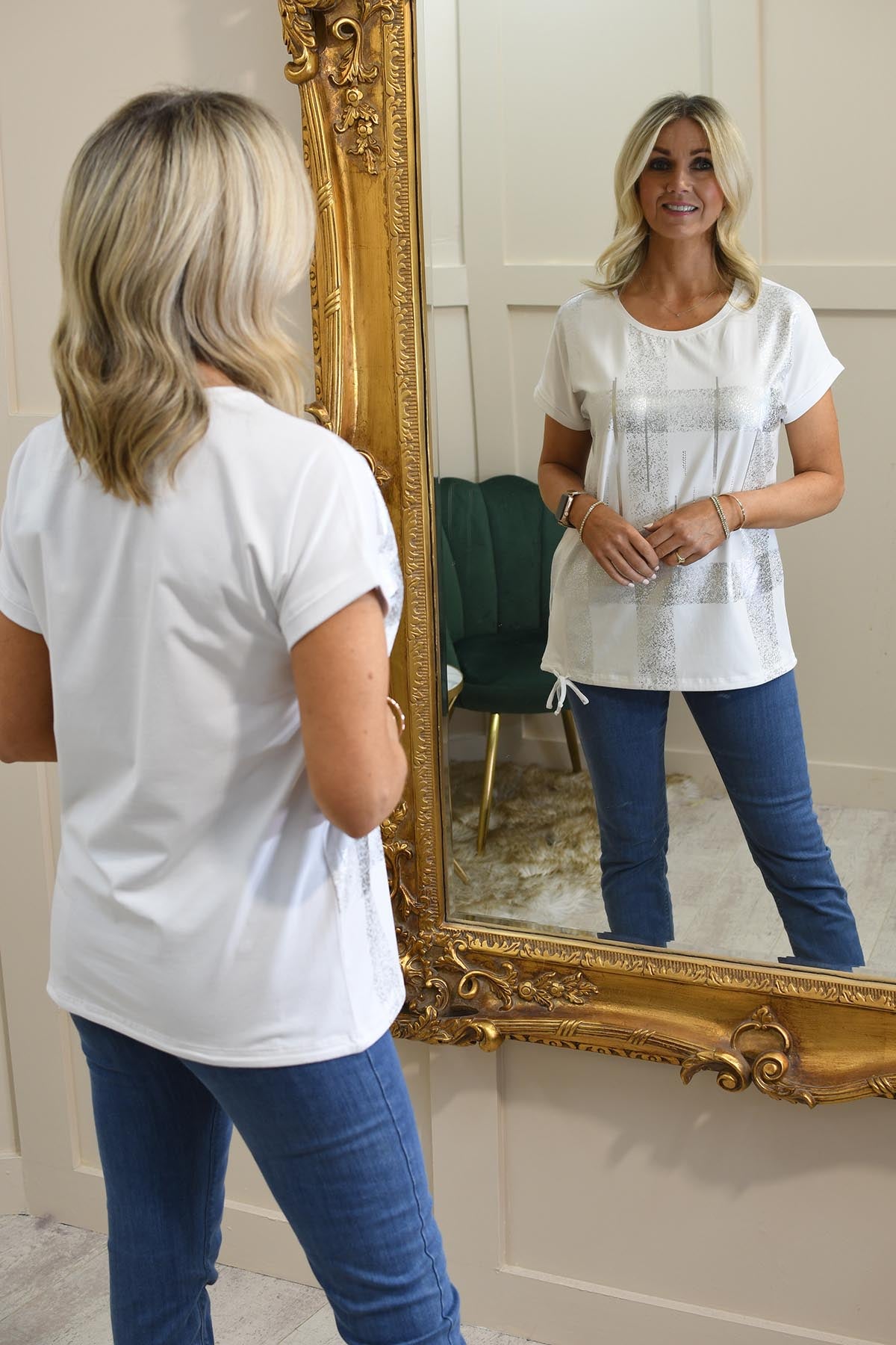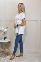 The I'CONA White Top With Metallic Silver Detail is a sleek and stylish essential that effortlessly elevates your casual wardrobe. Crafted from a soft and stretchy blend of 95% cotton and 5% elastane, this top offers ultimate comfort and a flattering fit. The crisp white fabric is beautifully enhanced by eye-catching metallic silver detailing, adding a touch of modern glamour to your outfit. Perfect for dressing up or down, it pairs seamlessly with jeans, trousers, or skirts for a chic, contemporary look. Make a statement with this versatile and fashion-forward piece.