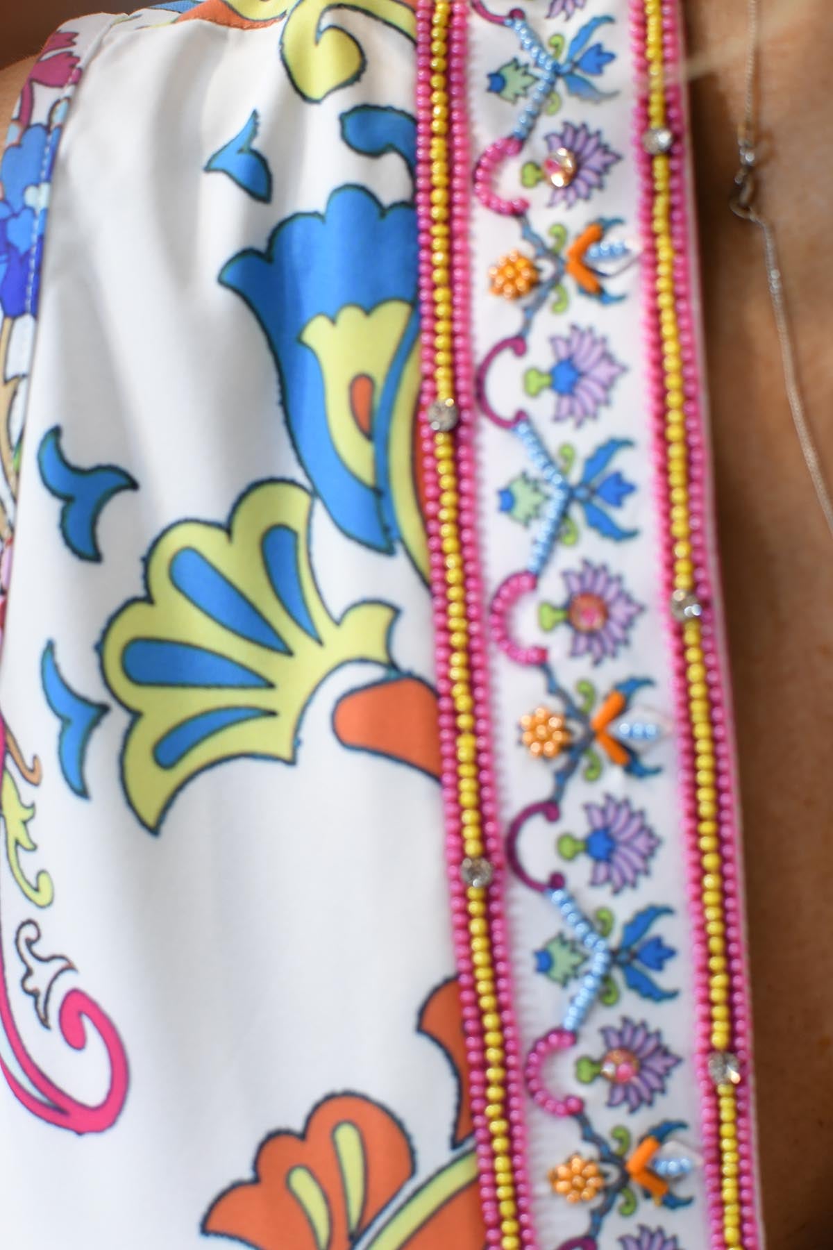 Make a statement with the K.Design Multicoloured Paisley Print Dress, a perfect blend of elegance and vibrancy. Featuring a stunning paisley pattern in a rich mix of colours, this dress exudes effortless charm. The beautifully beaded V-neckline adds a touch of glamour, making it ideal for both day and evening occasions. Designed for comfort and style, the lightweight fabric drapes beautifully, while the flattering silhouette enhances your figure. Whether paired with heels for a chic event or sandals for a relaxed look, this dress is a versatile must-have for your wardrobe. Elevate your fashion with K.Design’s signature sophistication.