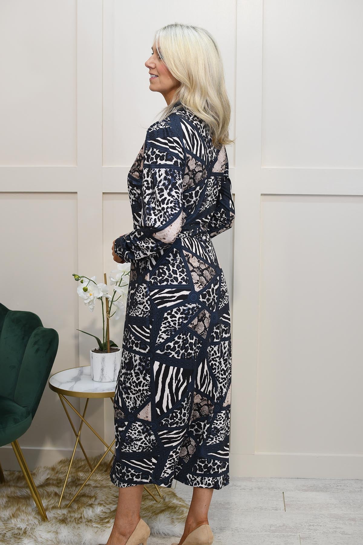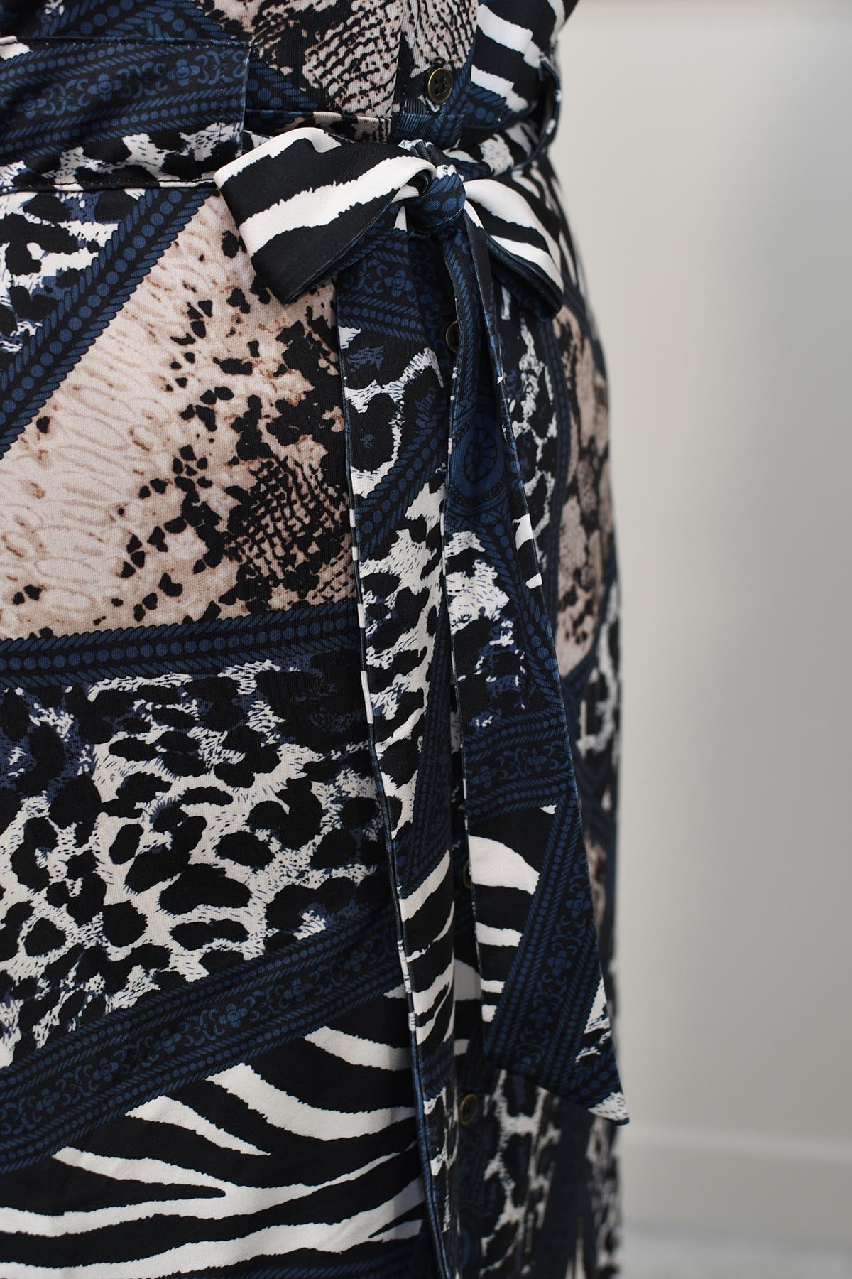 K.Design Marineblaues und beiges Maxikleid mit gemischtem Animalprint – Z227
