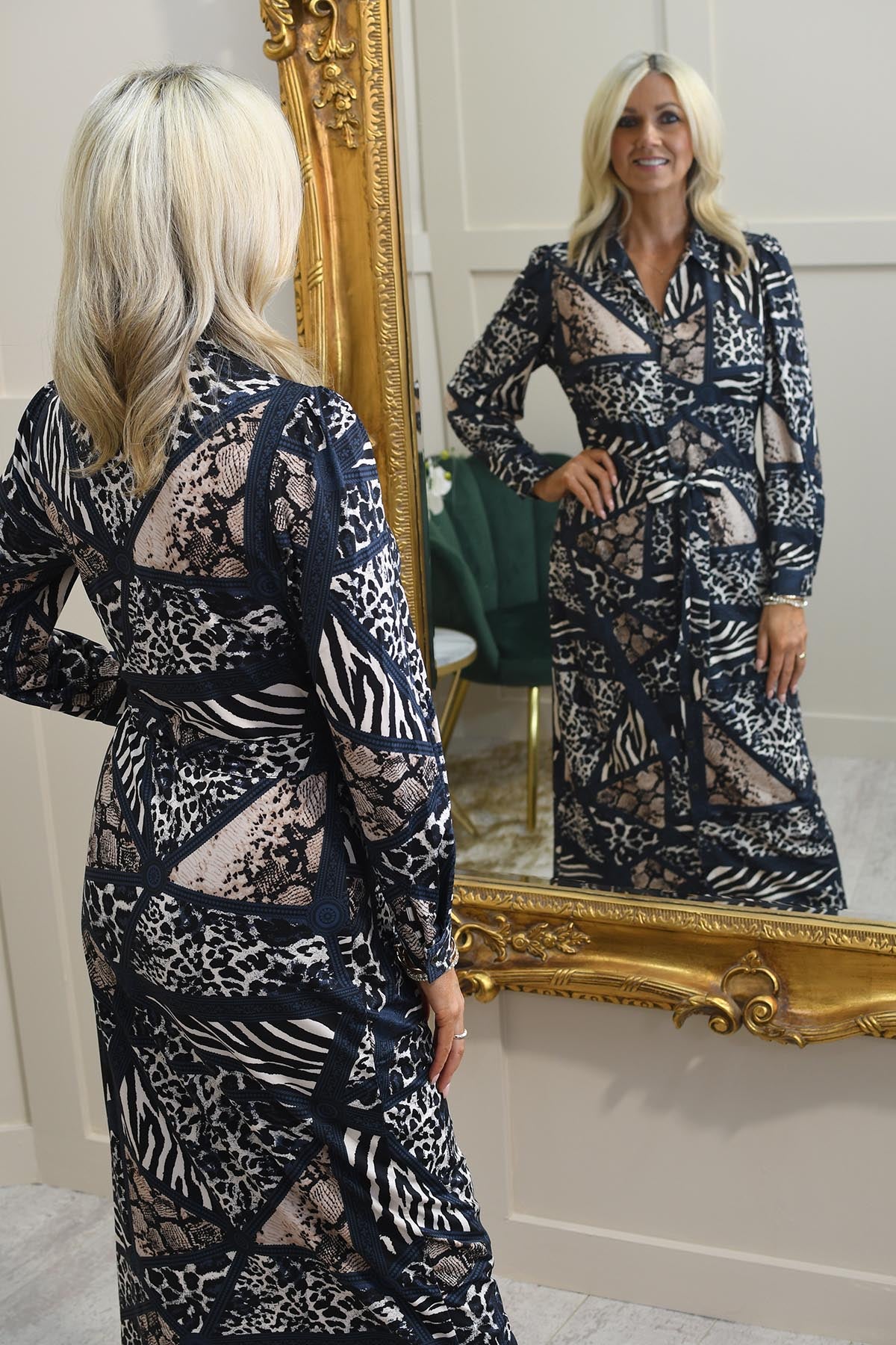 Das Maxikleid mit gemischtem Tiermuster in Marineblau und Beige von K.Design ist ein auffälliges und stilvolles Statement-Stück, das exotische Muster mit einer schicken, modernen Silhouette verbindet. Das Kleid besticht durch eine fesselnde Mischung aus Tiermustern in kontrastierenden Marine- und Beigetönen und bietet ein einzigartiges und auffälliges Design. Seine Maxilänge verleiht ein Gefühl von Eleganz und Fluss, während der weiche, leichte Stoff Komfort und mühelose Bewegung gewährleistet. Das Kleid hat einen schmeichelhaften V-Ausschnitt und lange Ärmel und ist somit perfekt für den Übergang von Tag zu Nacht. Dieses vielseitige Stück ist ideal für alle, die mit Leichtigkeit und Raffinesse einen modebewussten Eindruck machen möchten.
