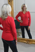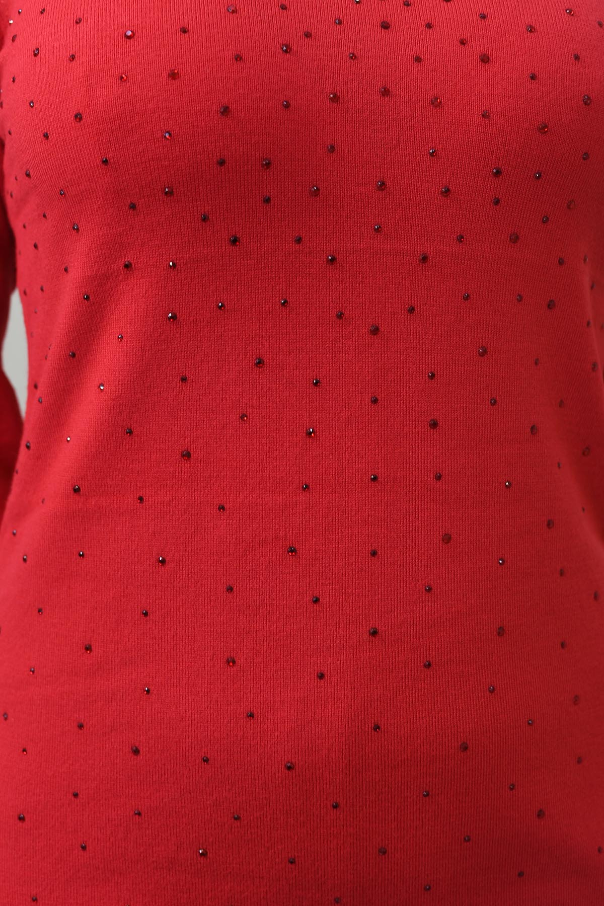 Weicher, marmorierter roter Pullover mit V-Ausschnitt und Strass-Detail – 7119 109