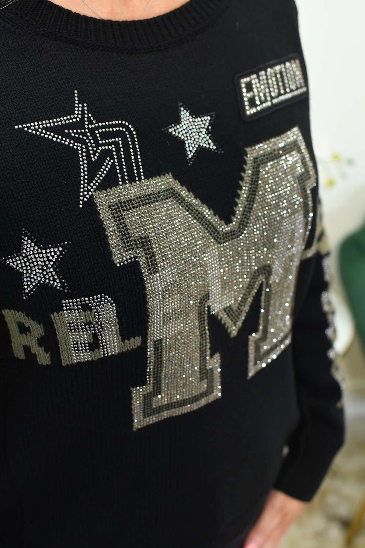 Monari Schwarzer Pullover mit Verzierungen in Khaki und Silber – 807816