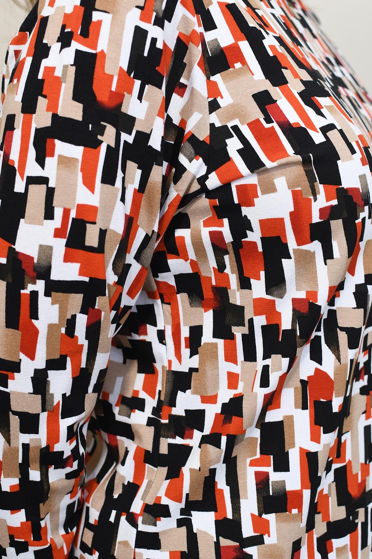 Dieses Oberteil aus weichem, hochwertigem Stoff bietet eine bequeme und schmeichelnde Passform, die sich wunderbar um den Körper legt. Der abstrakte Druck zeigt eine auffällige Mischung aus Orange, Beige und Schwarz und erzeugt ein optisch ansprechendes Muster, das Ihrem Outfit Tiefe und Interesse verleiht.