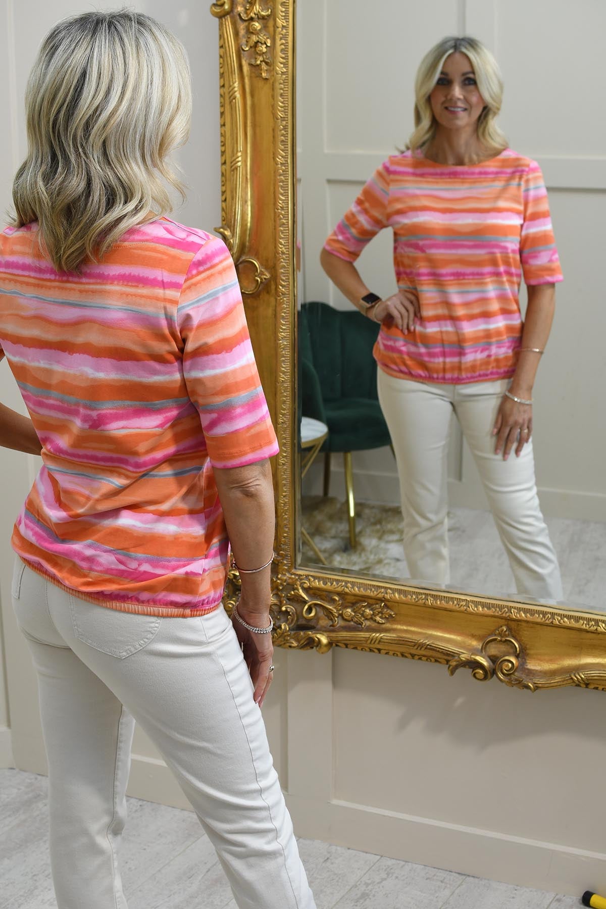 Brighten up your wardrobe with the Rabe Sunset Top, featuring a stunning gradient design in warm sunset hues. Crafted from a soft, breathable fabric, this top offers a lightweight feel and effortless comfort. The elasticated waist creates a flattering silhouette, while the classic round neckline and three-quarter sleeves add a timeless touch. Perfect for both casual and smart occasions, this eye-catching piece pairs beautifully with jeans or tailored trousers. Whether you're heading out for the day or dressing up for the evening, this versatile top brings a vibrant yet elegant style to any outfit.