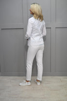 Die Robell White Seersucker Happy Jacket hat eine maßgeschneiderte Silhouette, strukturierte Schultern und eine schmale Passform, die die Figur elegant betont. Egal, ob Sie sich fürs Büro oder einen legeren Ausflug kleiden, diese Jacke strahlt mühelos Eleganz aus.