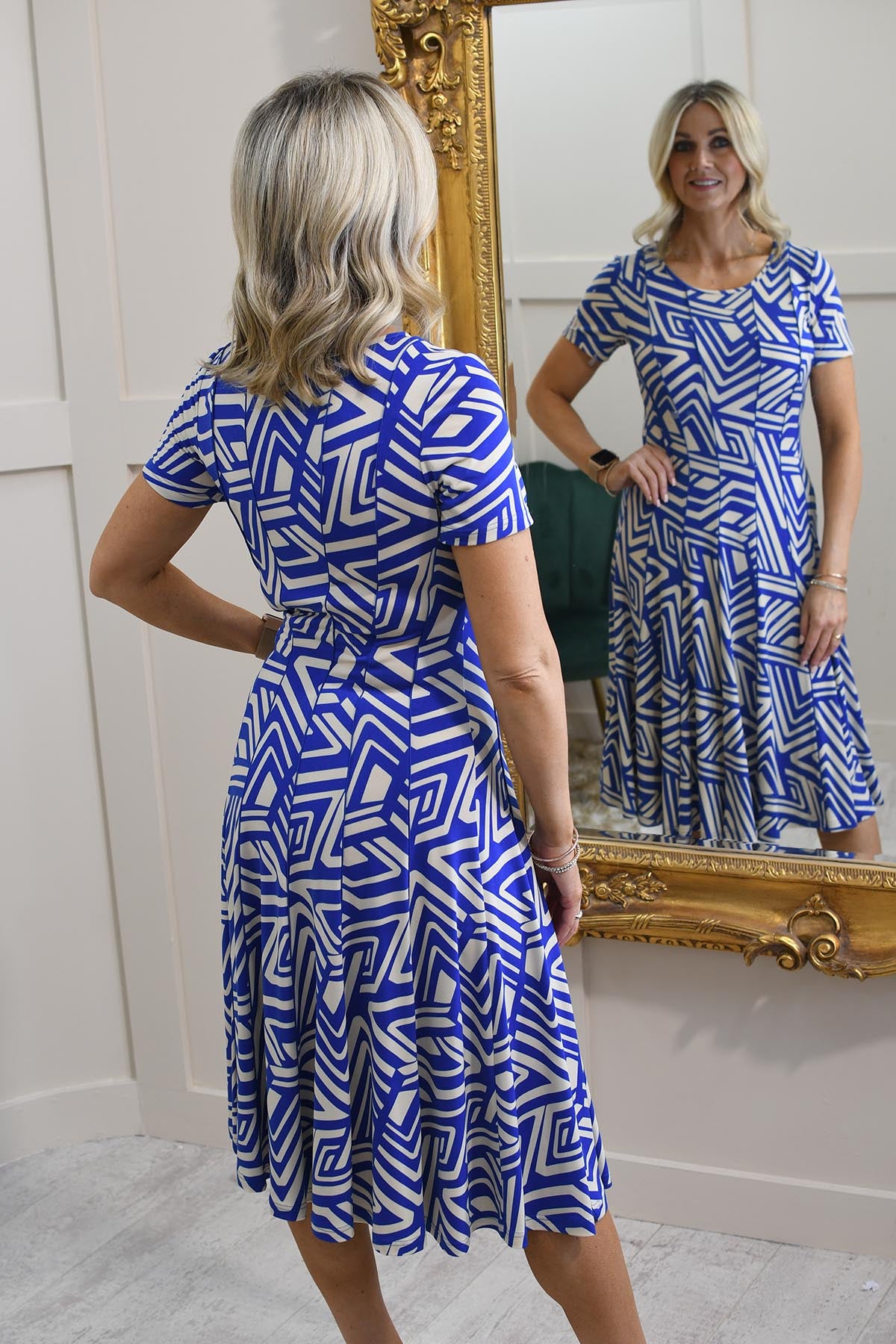 Tia Cobalt Blue & Beige Abstract Print Skater Dress Description