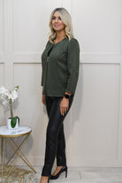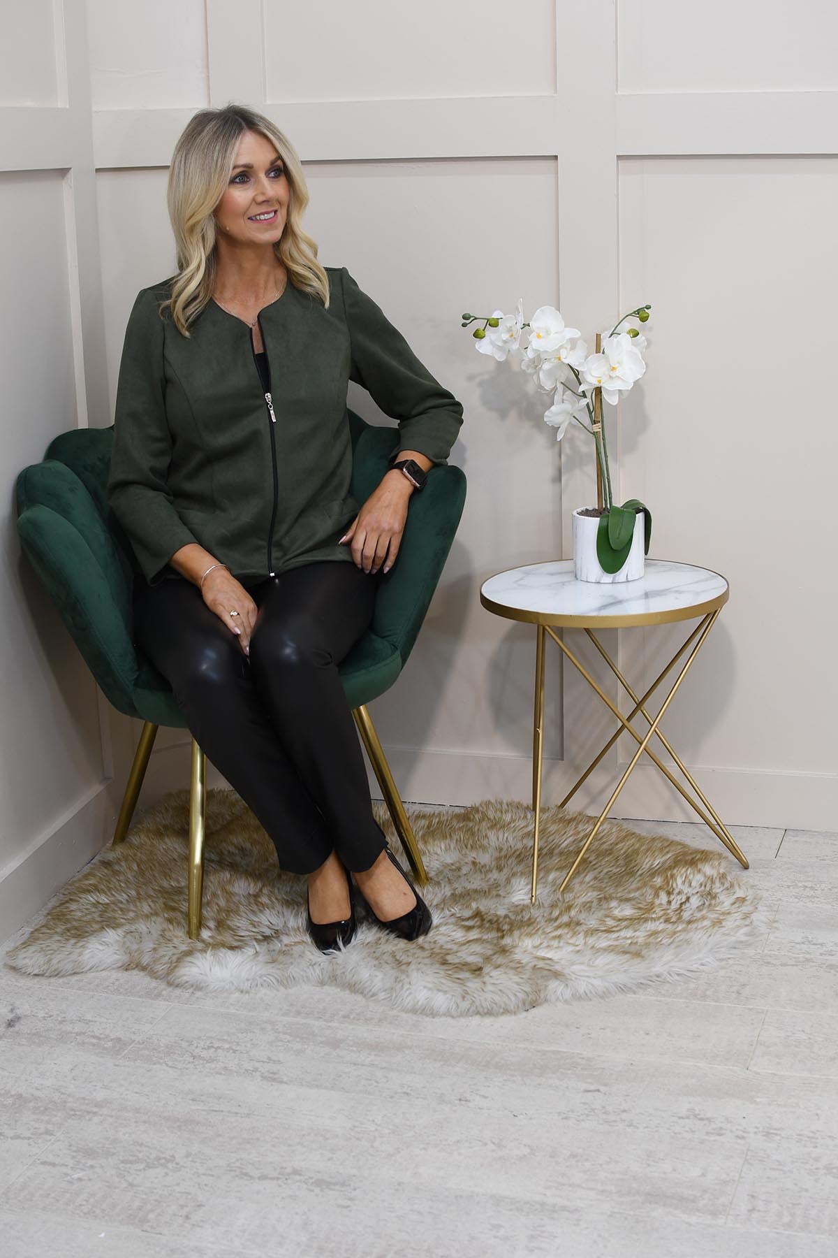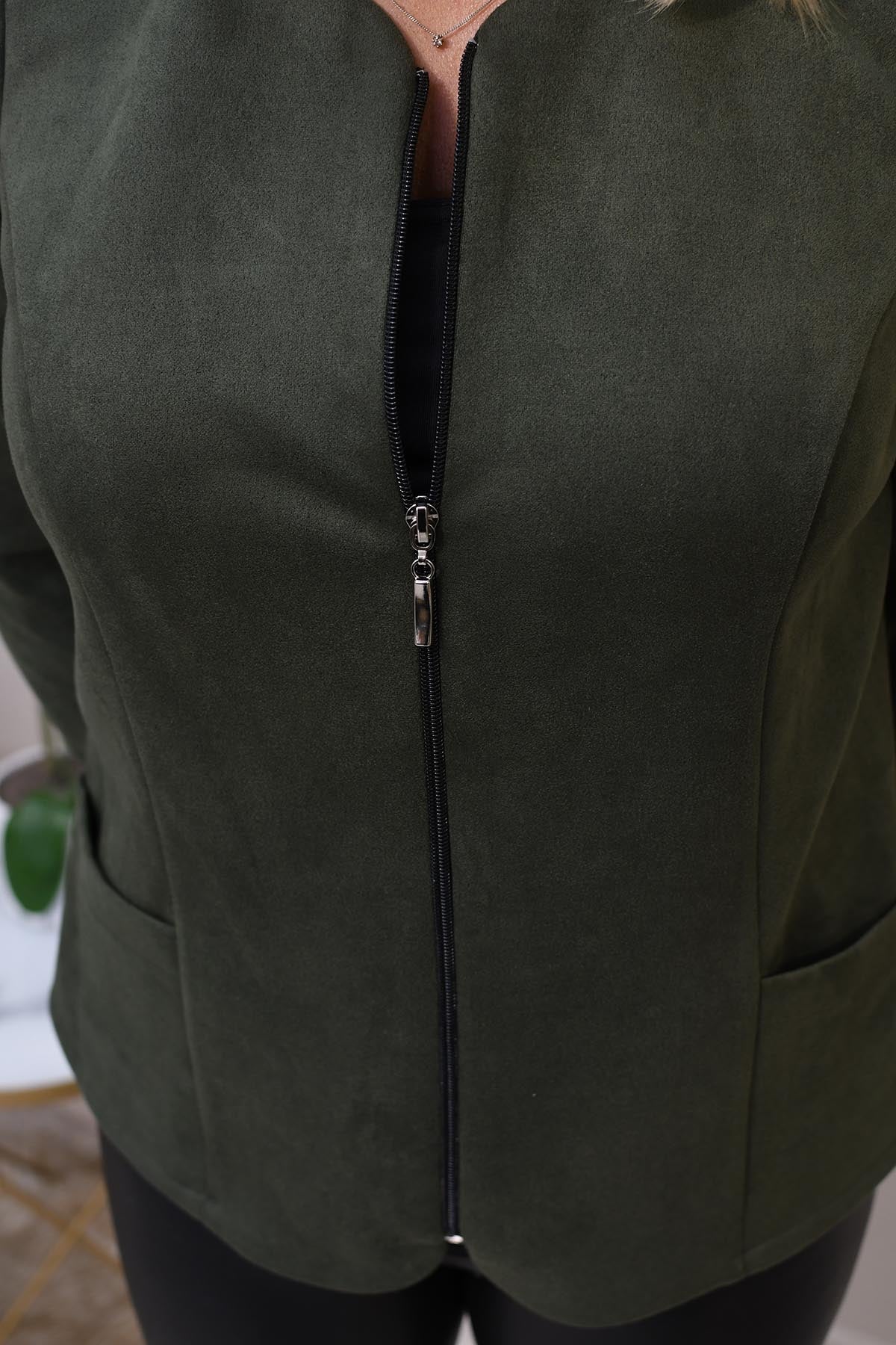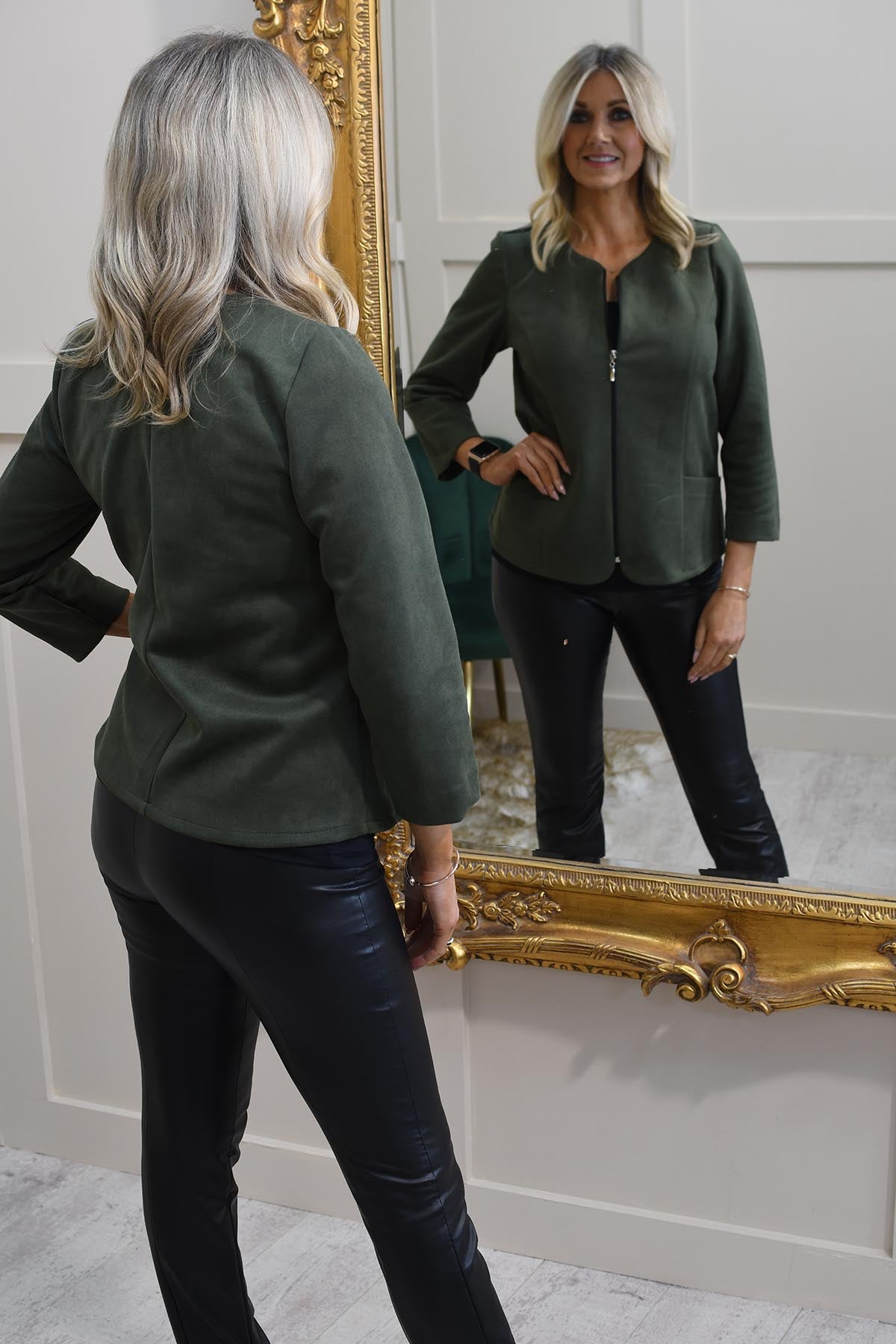 Upgrade your casual wardrobe with this chic suede-effect zip-up jacket in rich khaki. Crafted from a soft blend of 70% viscose and 30% polyester, it delivers lightweight comfort with a smooth, luxe finish that mimics real suede. The zip-up front ensures ease and versatility, while the relaxed silhouette makes it perfect for layering over tops, blouses, or knitwear. A modern essential, this jacket combines casual comfort with polished style, ideal for both daytime wear and weekend outings. Pair it with jeans for a laid-back look or tailored trousers for a smart-casual edge. A versatile piece for chic everyday dressing.