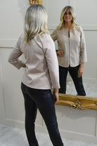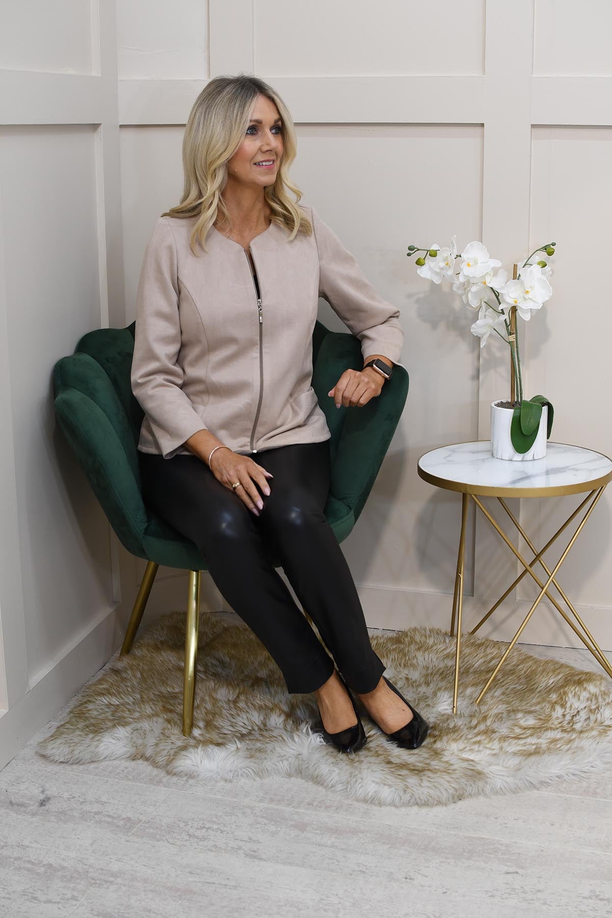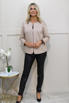 Upgrade your casual wardrobe with this chic suede-effect zip-up jacket in neutral sand. Crafted from a soft blend of 70% viscose and 30% polyester, it delivers lightweight comfort with a smooth, luxe finish that mimics real suede. The zip-up front ensures ease and versatility, while the relaxed silhouette makes it perfect for layering over tops, blouses, or knitwear. A modern essential, this jacket combines casual comfort with polished style, ideal for both daytime wear and weekend outings. Pair it with jeans for a laid-back look or tailored trousers for a smart-casual edge. A versatile piece for chic everyday dressing.