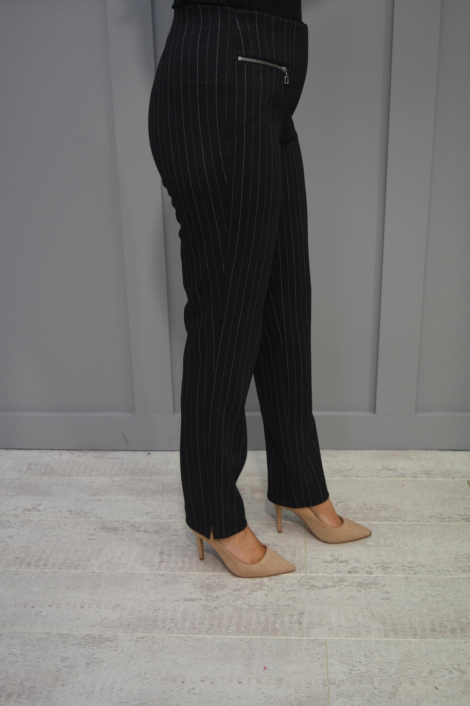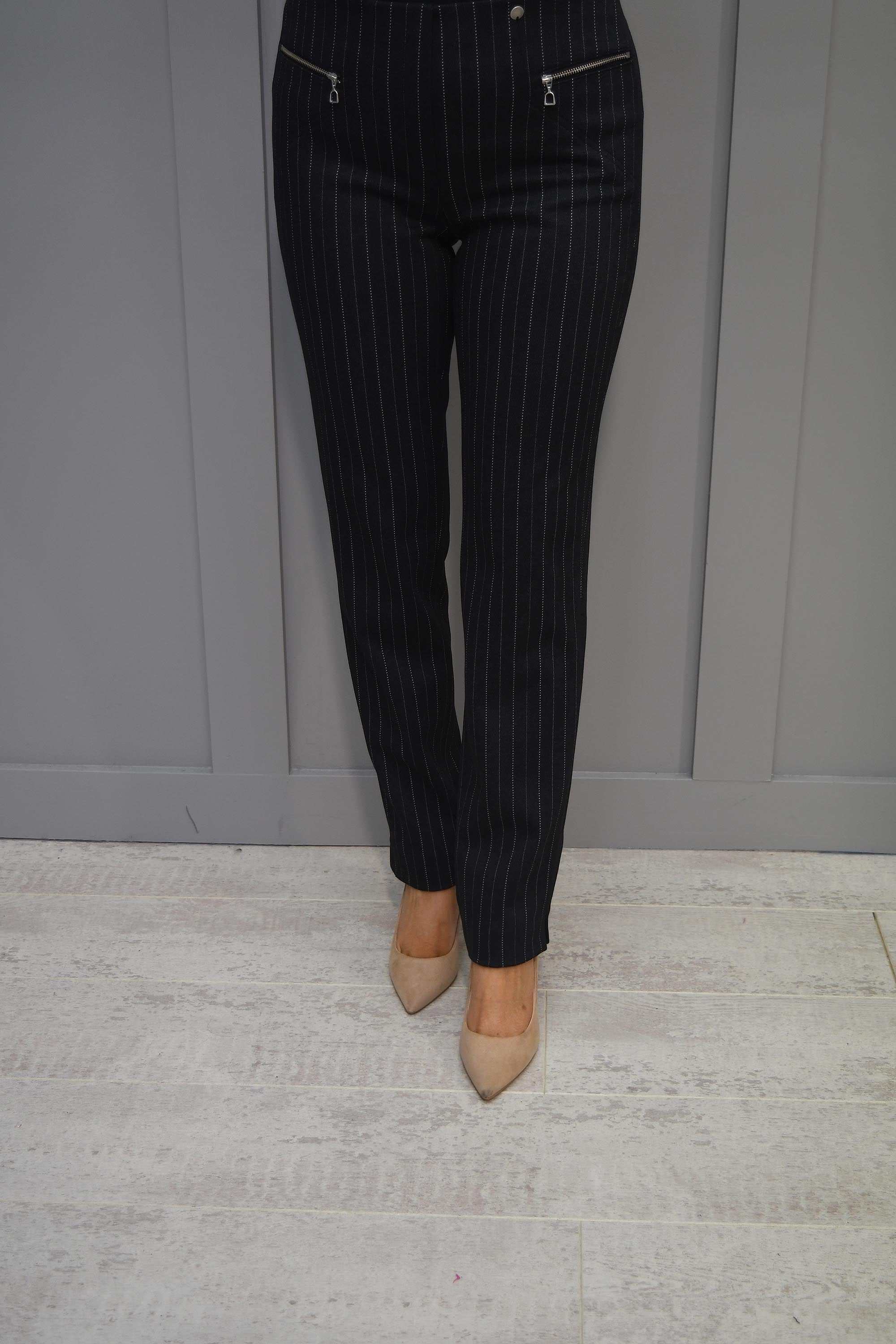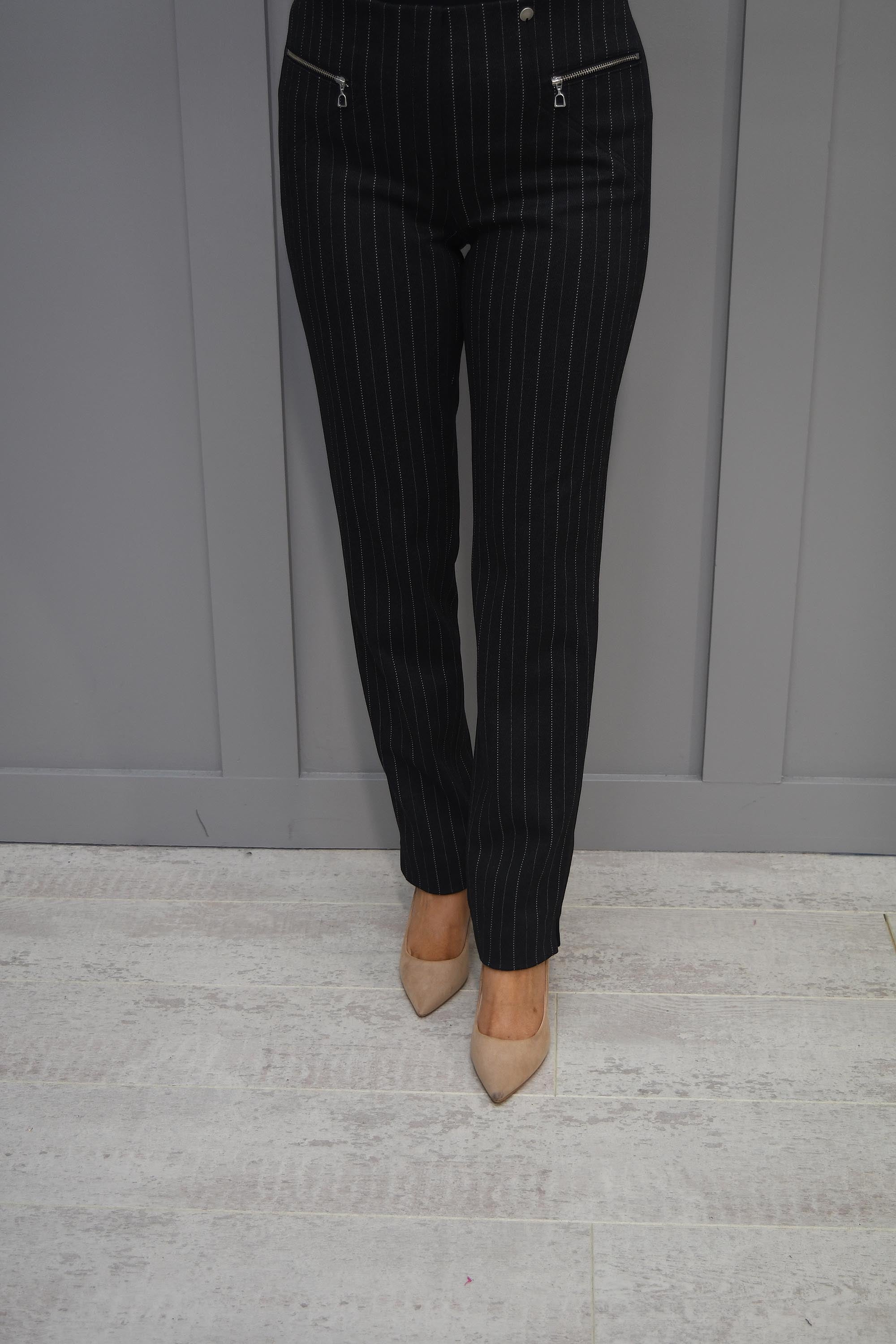 Donnez du peps à votre garde-robe avec le fabuleux pantalon noir Modern Mimi avec fermeture éclair sur le devant de Robell. Ce pantalon slim confortable est confectionné dans un tissu doux avec un motif à fines rayures en gris foncé et blanc. Avec une taille haute et deux poches zippées sur le devant, ce pantalon foncé est unique mais polyvalent.